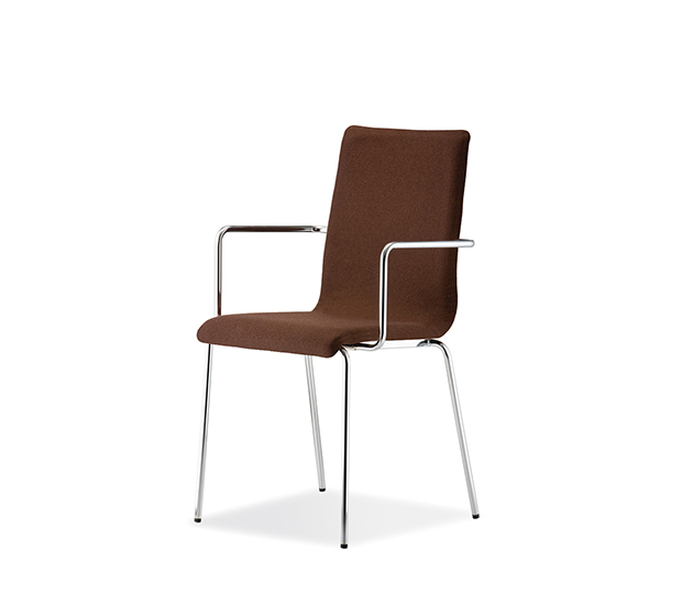 Stackable* armchair. Upholstered seat and back, chromed, matt chromed or silver powder coated square steel tub frame.