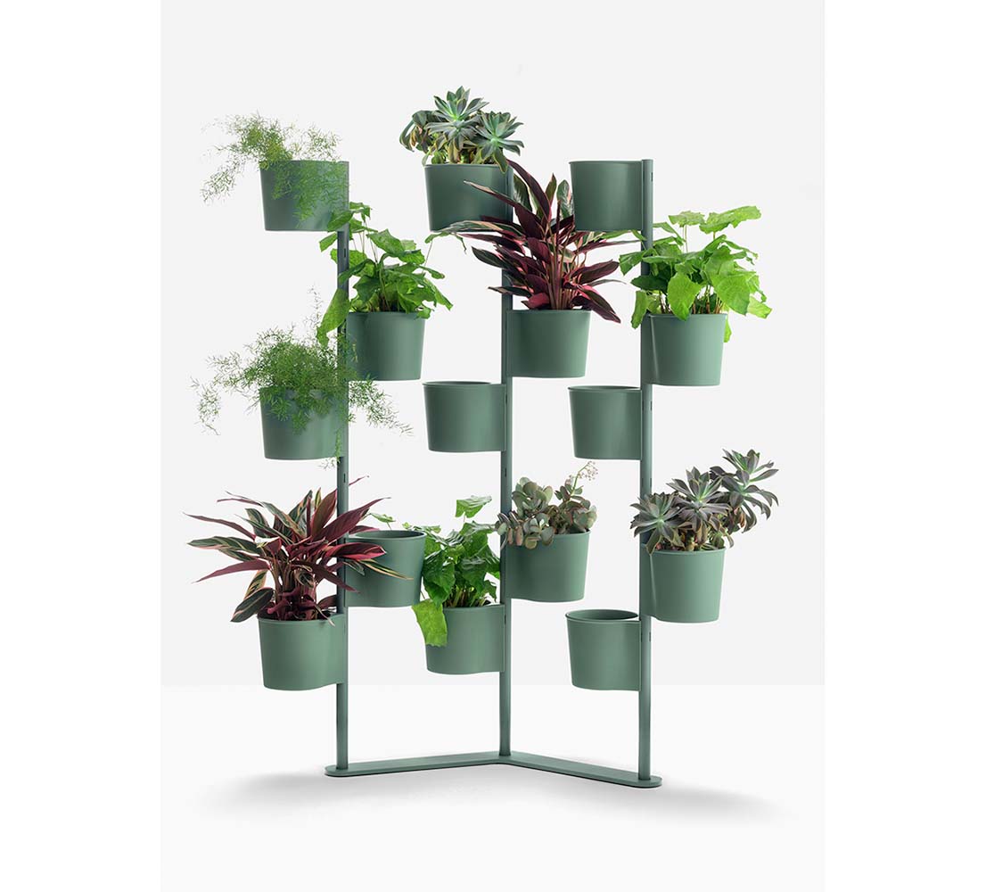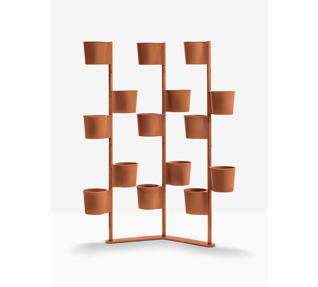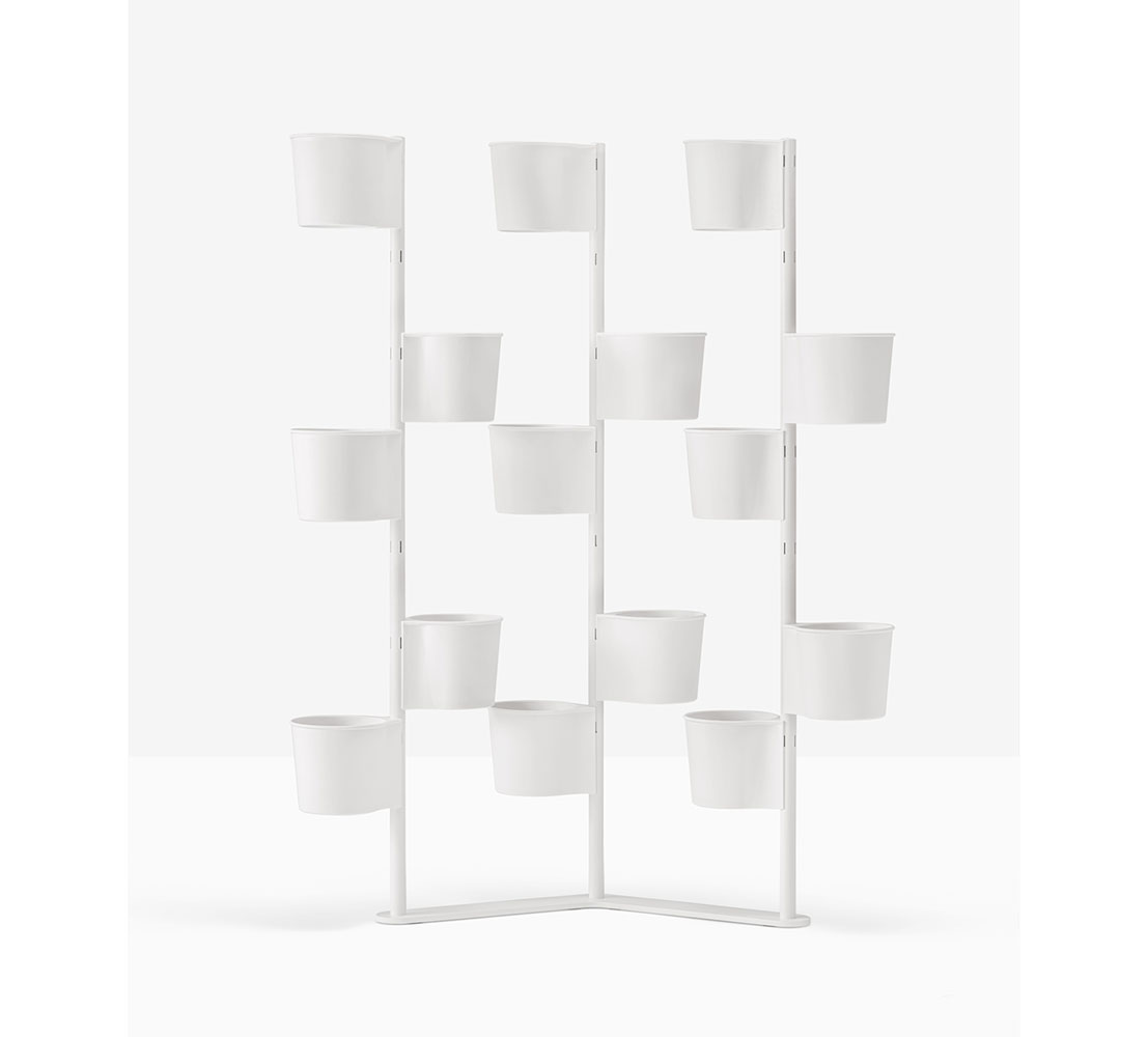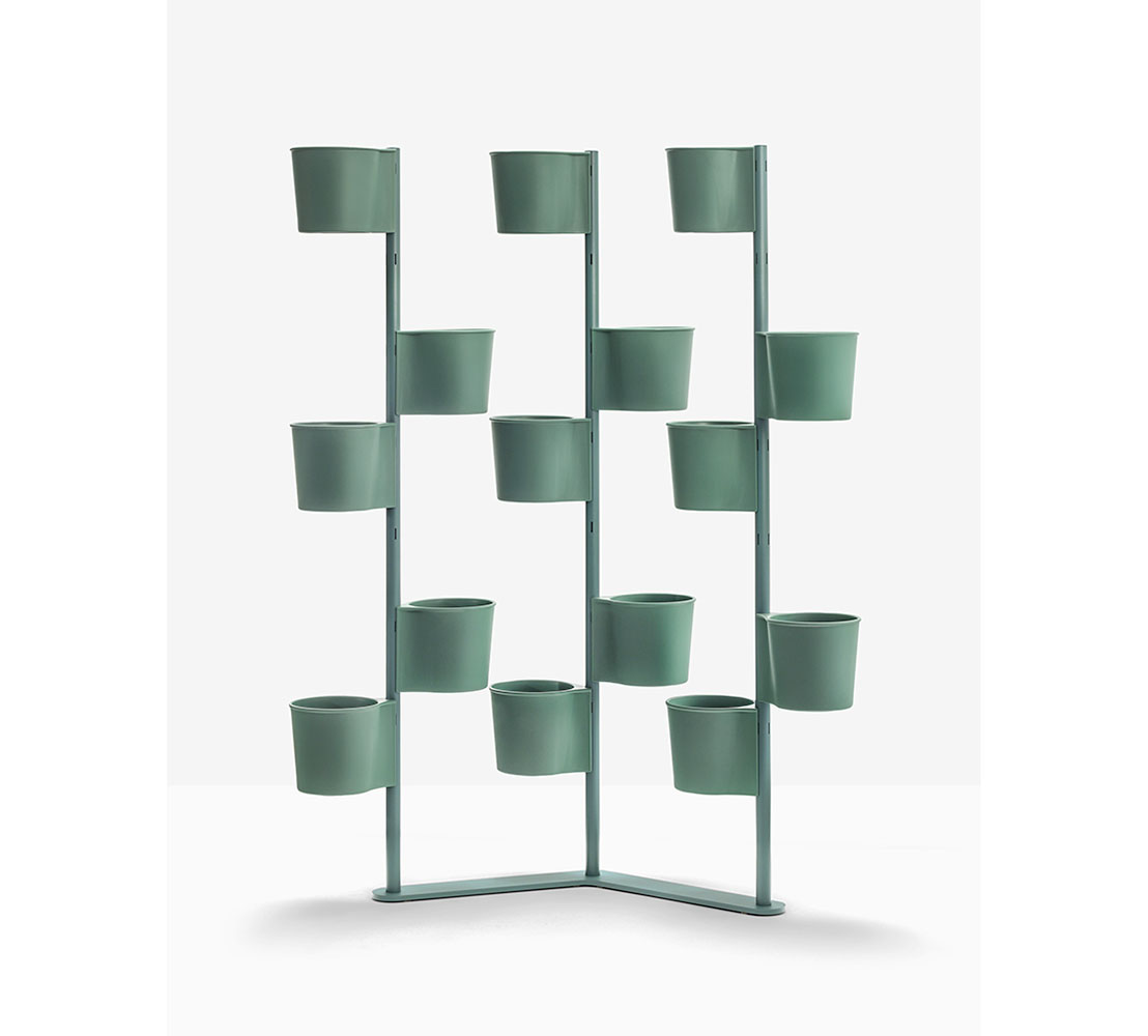 Hevea Partition is a versatile furnishing element that creates green walls and layouts in work and hospitality spaces. This pot-holder consists of a shaped base and three steel columns to which fifteen polypropylene pots are hung. The pots are easy to attach, either opposite one another or in a spiral. The Hevea Partition elements fasten mechanically and are therefore easily separable for cleaning purposes. The different components can be disposed of correctly at the end of their life cycle. Additional pots can be hung to the structure, sold separately.