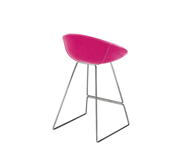 Bar height stool. Upholstered seat and back, chromed or powder coated round steel tub frame.