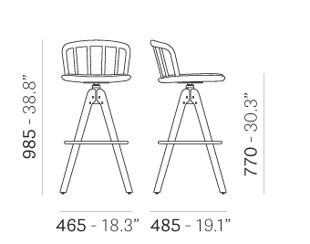 Bar-height swivel stool. Arched bentwood backrest, upholstered solid wood seat. Trestle-style base in solid ash wood. Steel footrest.