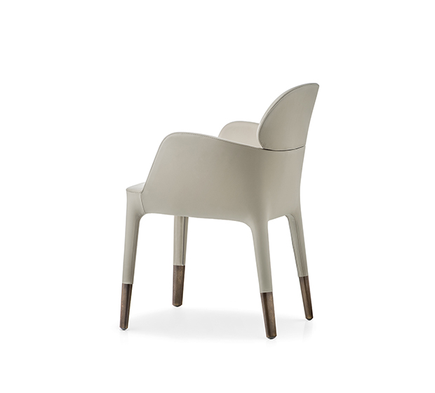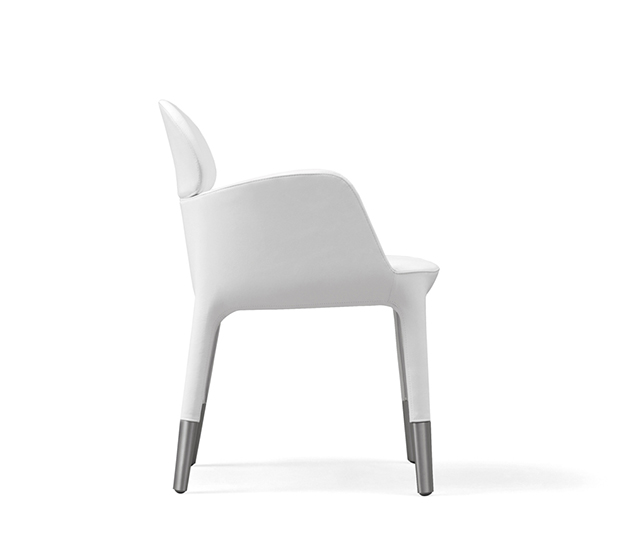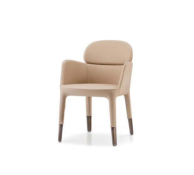Chaise avec bras. Assise, dossier et partie supérieure des pattes rembourrés, extrémités des pattes en nickel brossé, bronze brossé ou nickel noir.