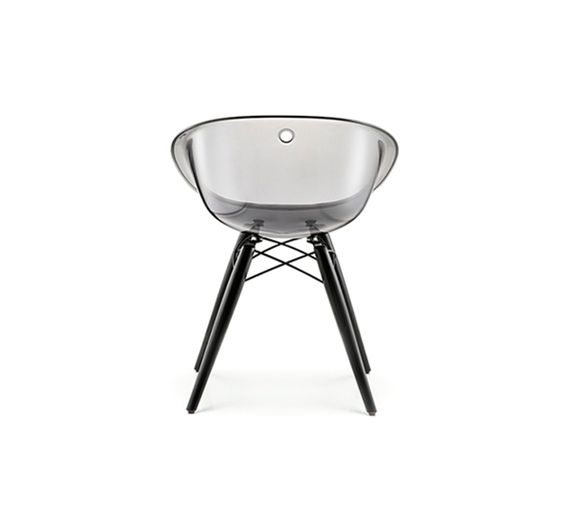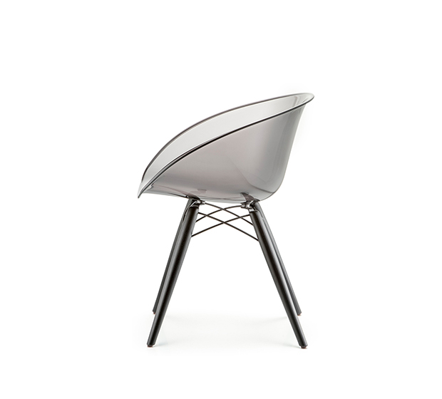 Chaise avec bras. Assise et dossier en polycarbonate, structure à 4 pattes en frêne avec barres de jonction en métal.