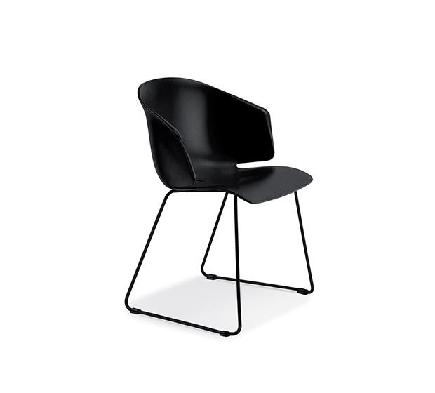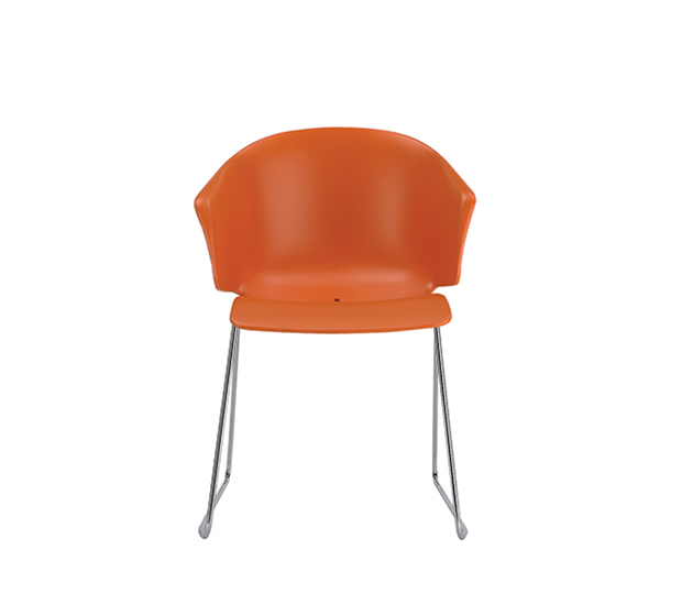 Chaise avec bras à base traîneau, empilable. Assise et dossier en polypropylène renforcé de fibre de verre, résistant aux rayons UV, structure tubulaire en acier chromé ou peint.