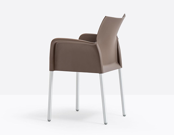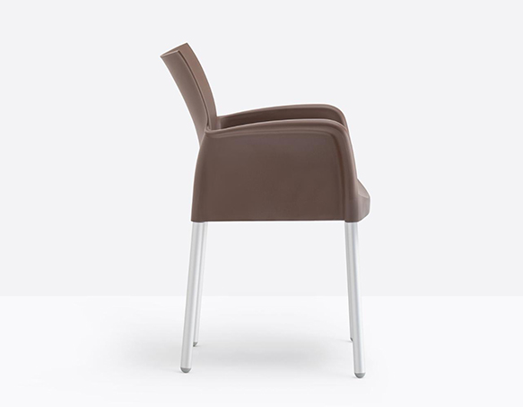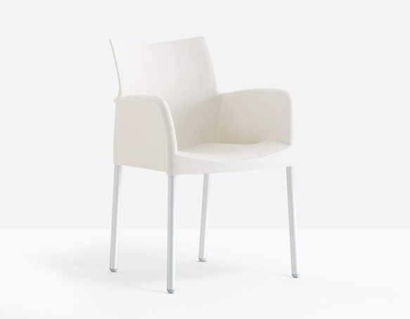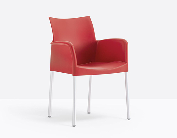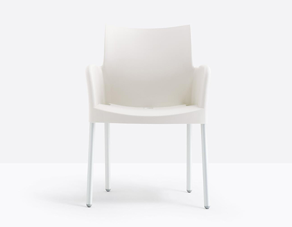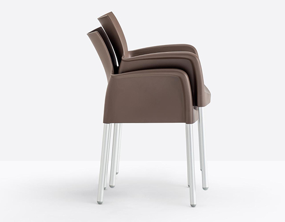 Chaise avec bras, empilable. Assise et dossier en polypropylène résistant aux rayons UV, structure tubulaire ronde en aluminium anodisés. Adapté à l’usage extérieur.