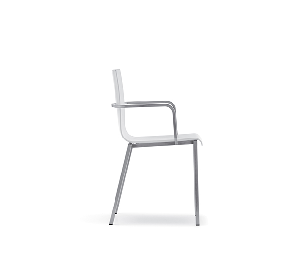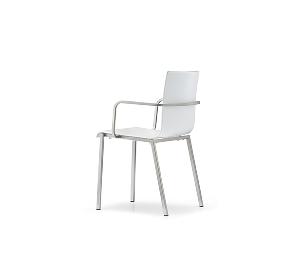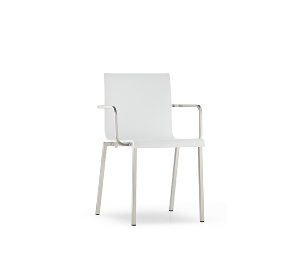 Chaise avec bras, empilable. Assise et dossier en technopolymère, structure tubulaire carrée en acier chromé, satiné ou peint.