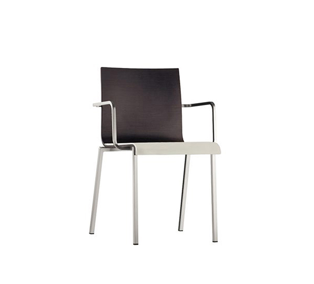 Chaise avec bras, empilable*. Assise et dossier en bois avec coussin rembourré sur l’assise, structure tubulaire carrée en acier chromé, satiné ou peint.