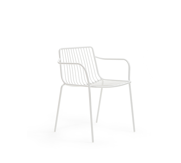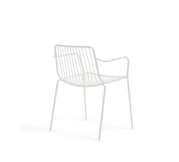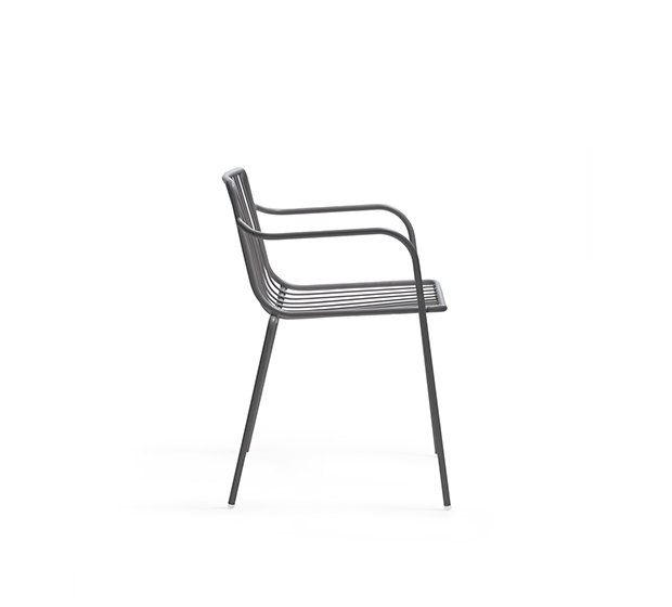 Chaise avec bras. Entièrement fait en tige d’acier peint avec dossier bas. Adapté à l’usage extérieur.