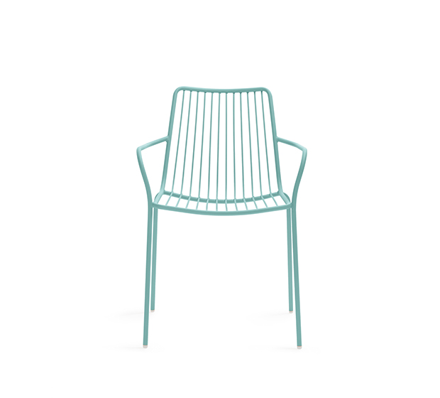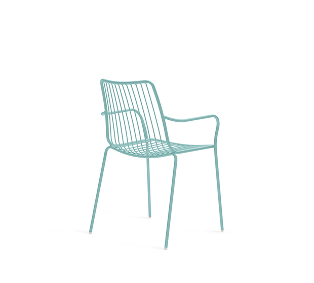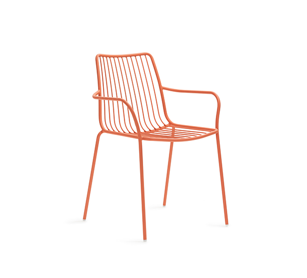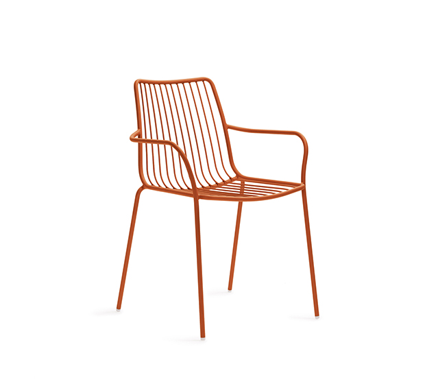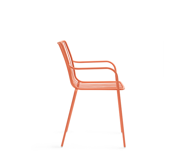 Chaise avec bras. Entièrement fait en tige d’acier peint et avec dossier haut. Adapté à l’usage extérieur.