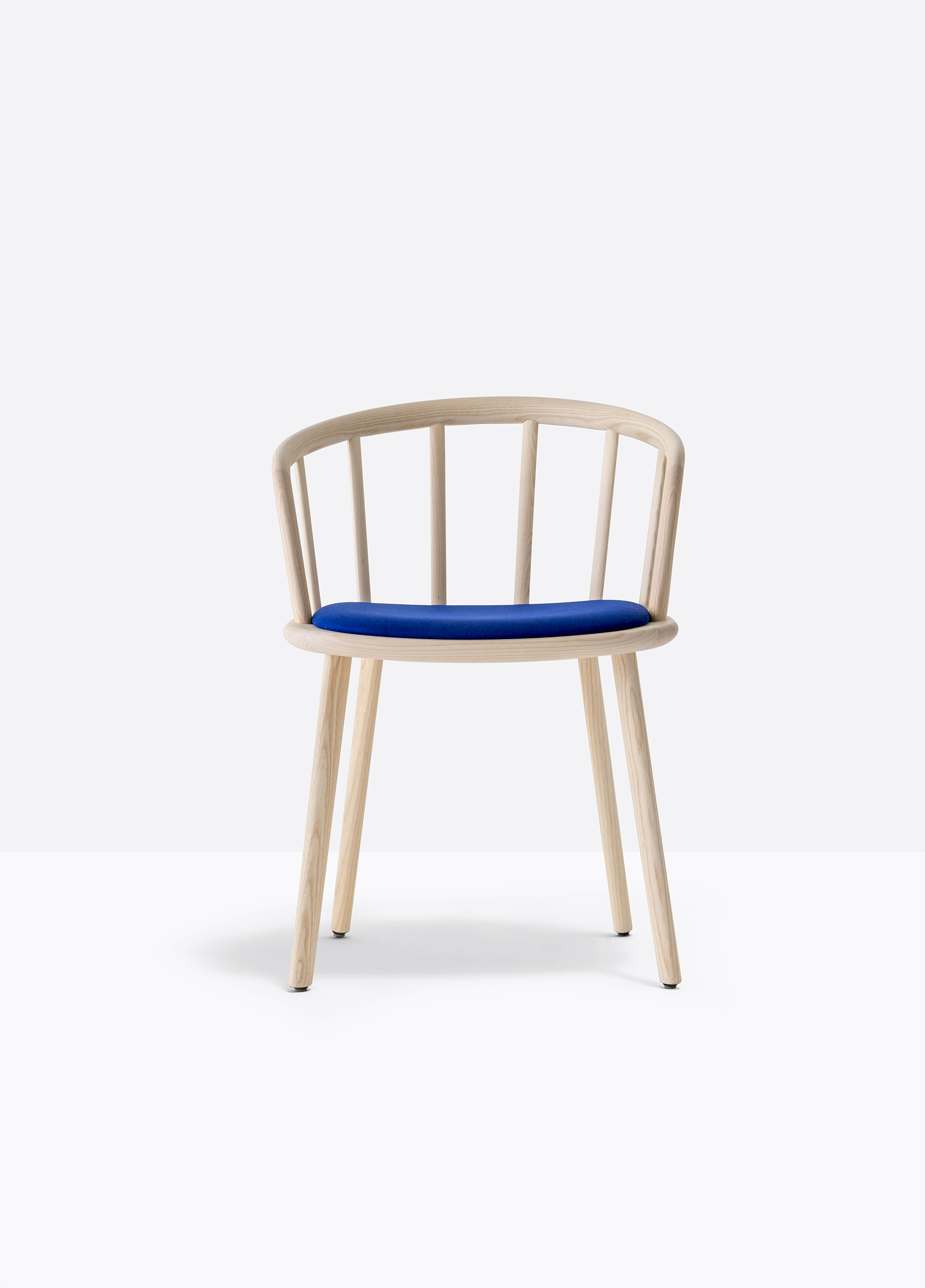 Chaise avec bras. Assise coussinée. Structure et pattes en bois de frêne. Dossier vouté en bois courbé.