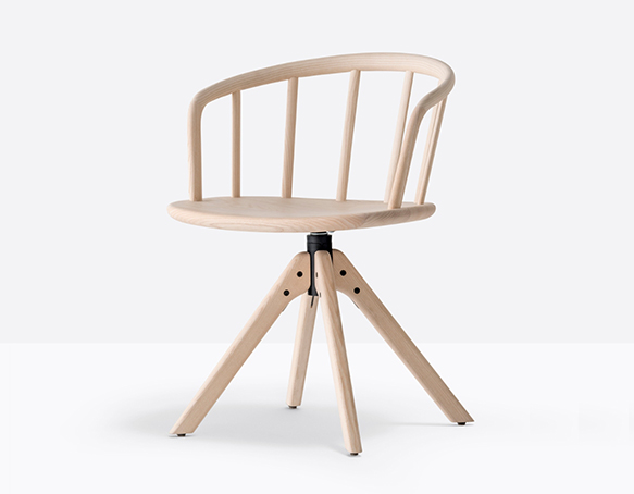 Chaise avec bras. Assise, dossier et structure en bois de frêne. Dossier vouté en bois courbé. Base centrale pivotante avec mécanisme de retour.