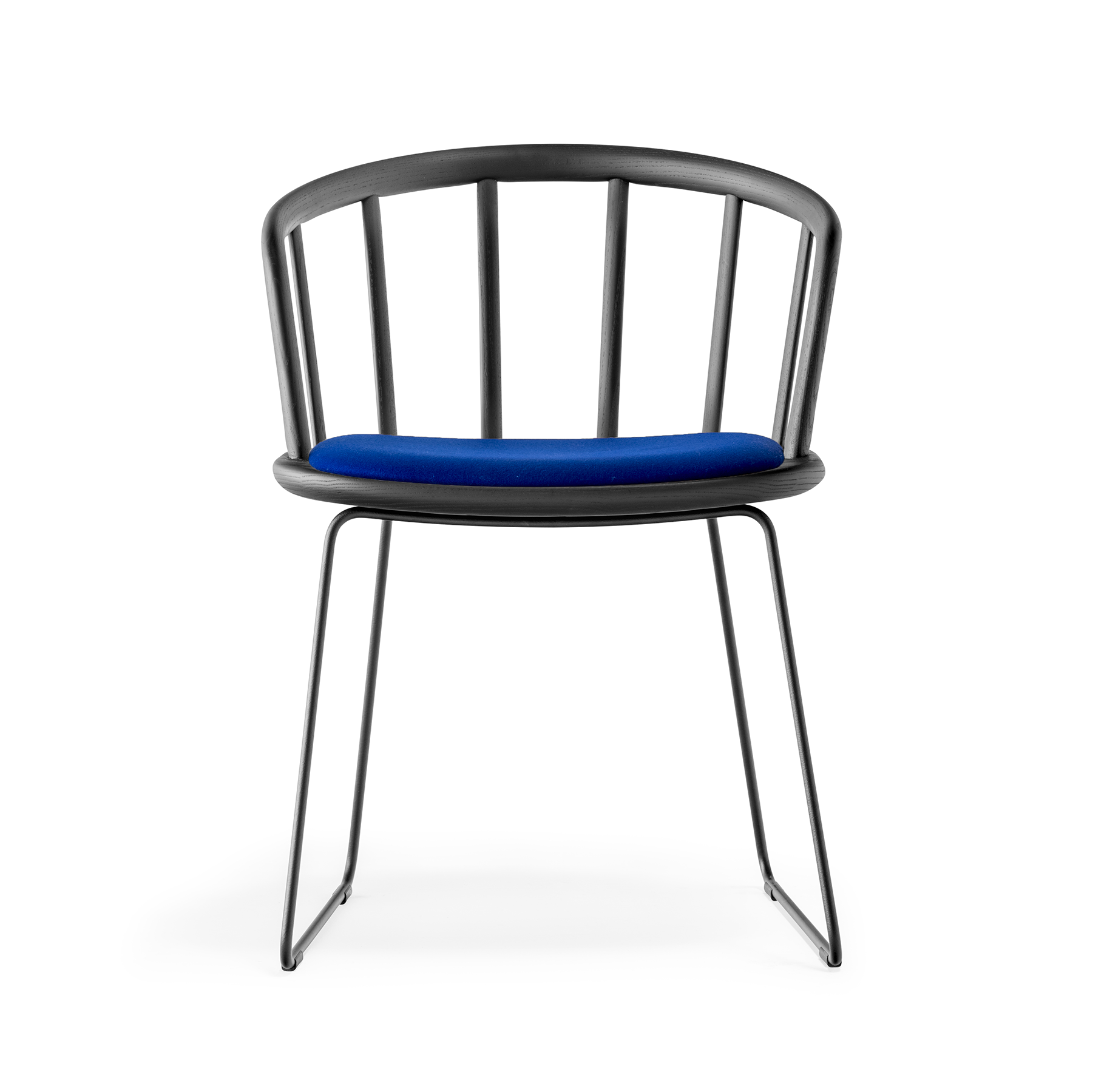 Chaise avec bras. Dossier vouté en bois de frêne courbé. Assise coussinée. Structure traîneau en fil d’acier.