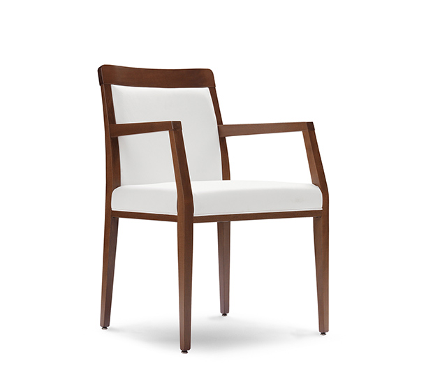 Chaise avec bras. Assise et dossier rembourrés, structure en hêtre fini aniline, laqué ou antique.