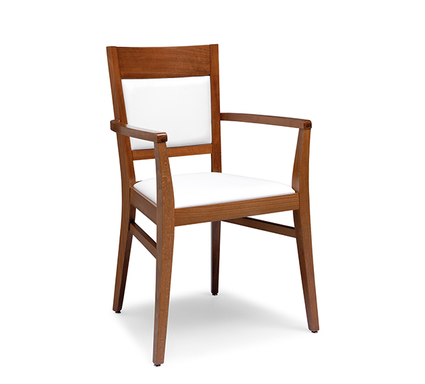 Chaise avec bras. Assise et dossier rembourrés, structure en hêtre fini aniline, laqué ou antique.
