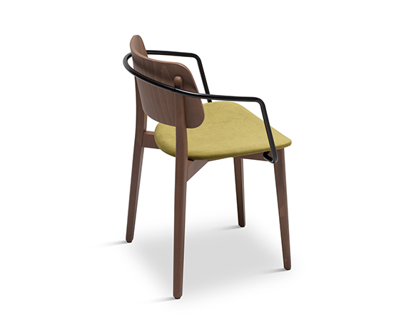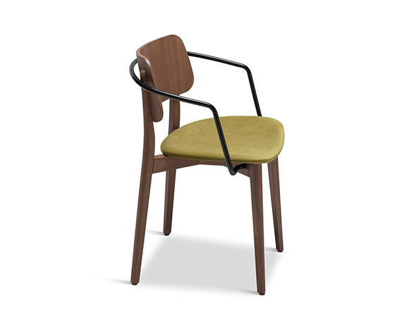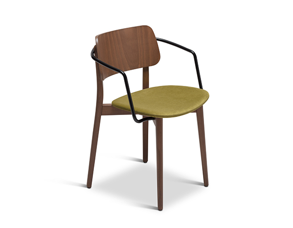 Chaise à bras. Empilable. Structure en bois, assise rembourrée, bras en métal.