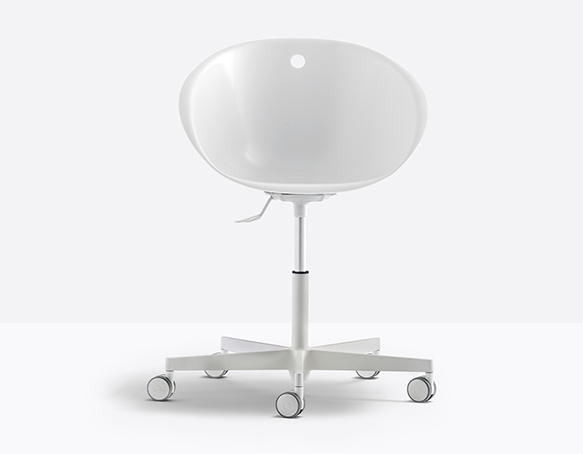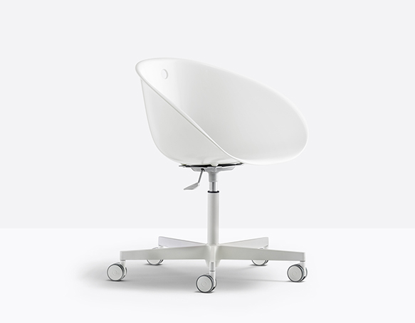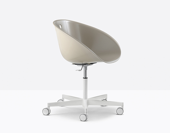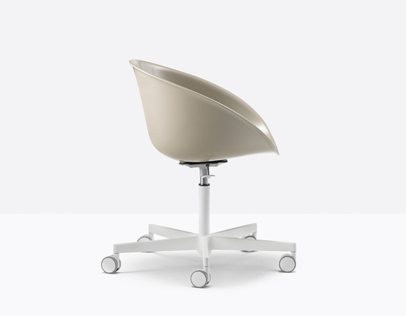 Chaise pivotante, hauteur ajustable. Coquille en technopolymère, base en fonte d’aluminium à 5 rayons sur roulettes.