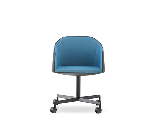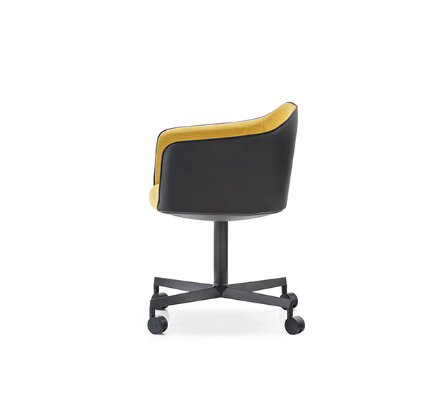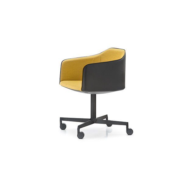 Chaise avec bras à roulettes. Assise et dossier rembourrés, structure à 4 rayons en métal poli ou peint.