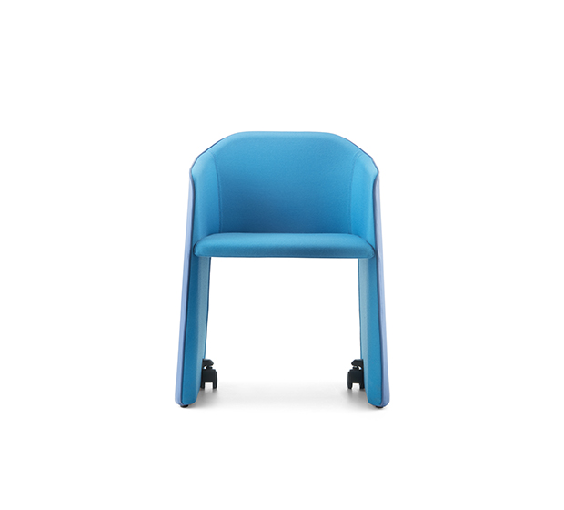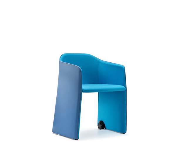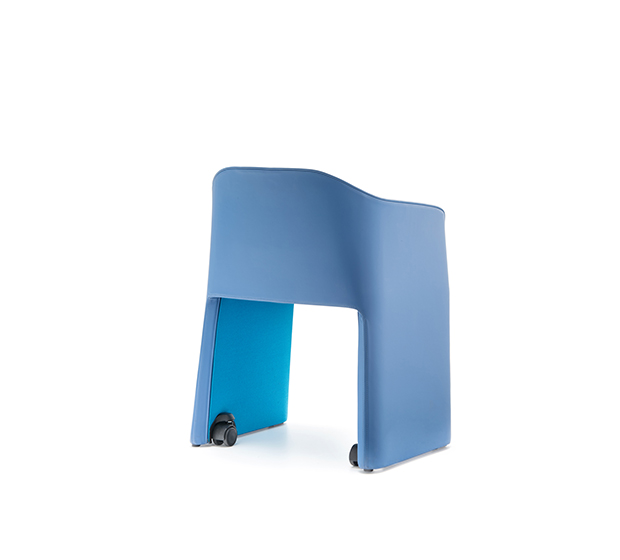 Chaise à bras avec deux roulettes à l’arrière. Entièrement rembourrée.
