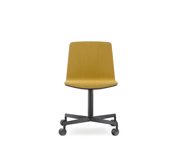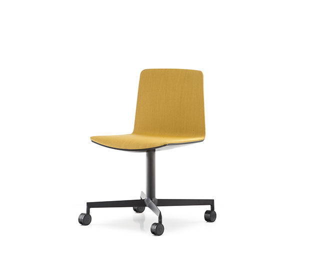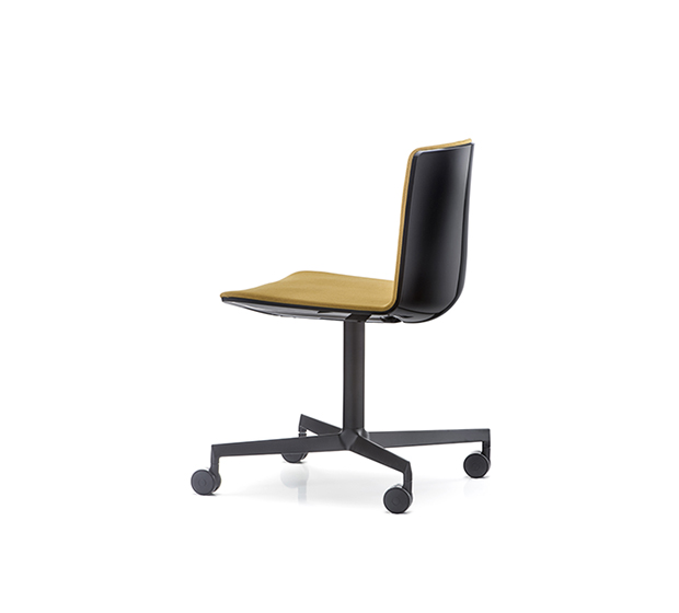 Chaise à roulettes. Assise et dossier rembourrés à l’intérieur, extérieur en polycarbonate, structure à 4 rayons en aluminium poli ou peint.