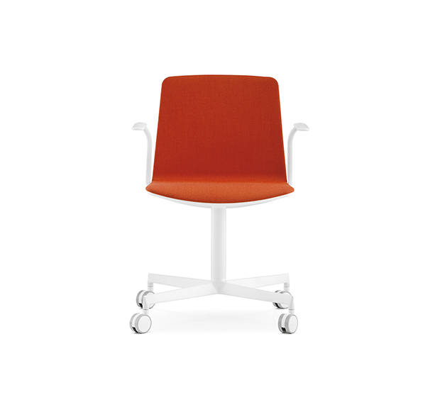 Chaise à roulettes avec bras. Assise et dossier rembourrés à l’intérieur, extérieur en polycarbonate, structure à 4 rayons en aluminium poli ou peint.