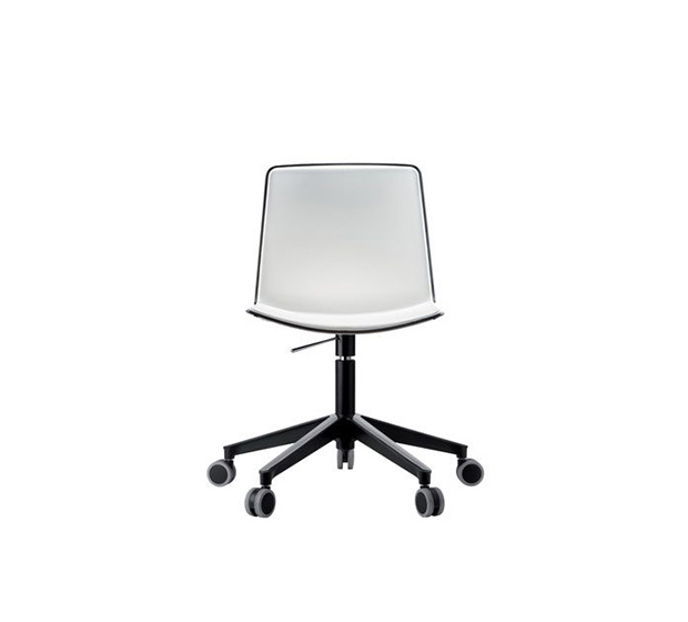 Chaise sans bras à roulettes, avec pied central, pivotante et ajustable en hauteur. Assise et dossier en polypropylène, fini brillant à l’extérieur et fini anti-rayure mat à l’intérieur, structure à 5 rayons en acier peint.