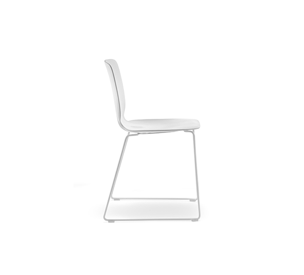 Chaise sans bras à base traîneau, empilable. Assise et dossier en polypropylène, structure tubulaire ronde en acier chromé ou peint.