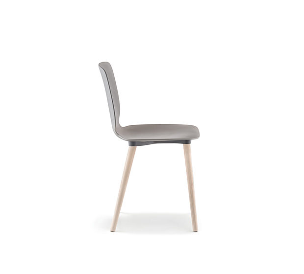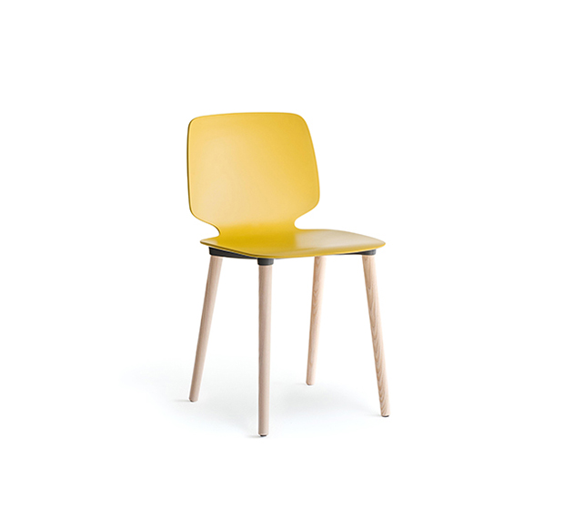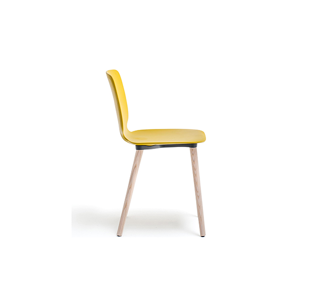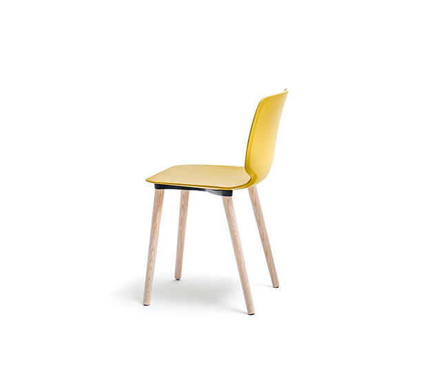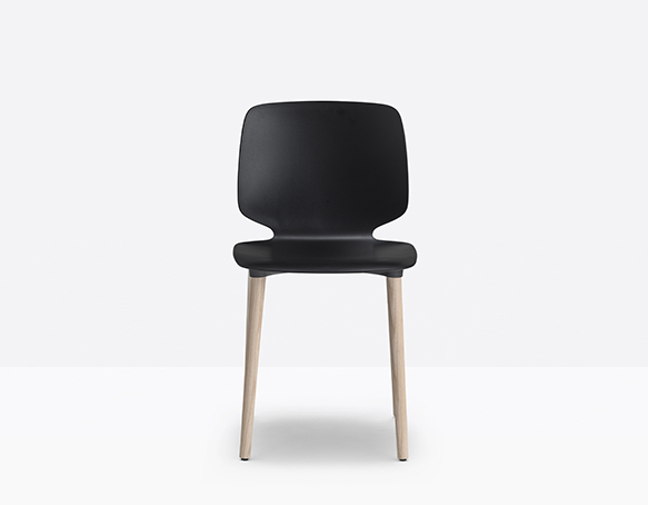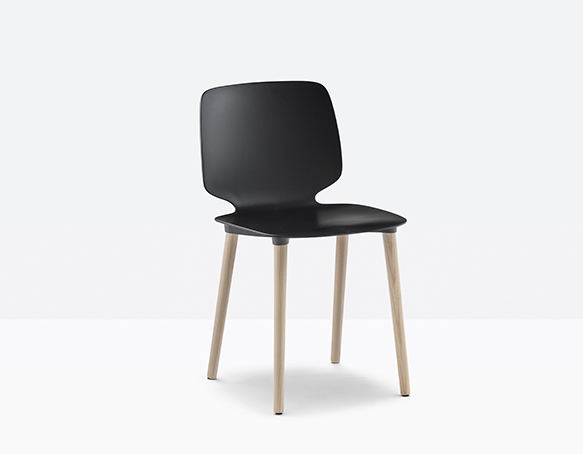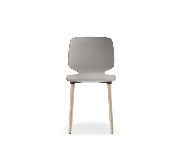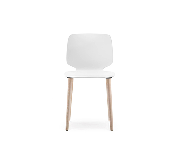 Chaise sans bras. Assise et dossier en technopolymère, structure à 4 pattes en frêne.