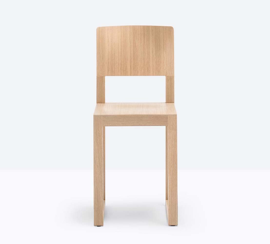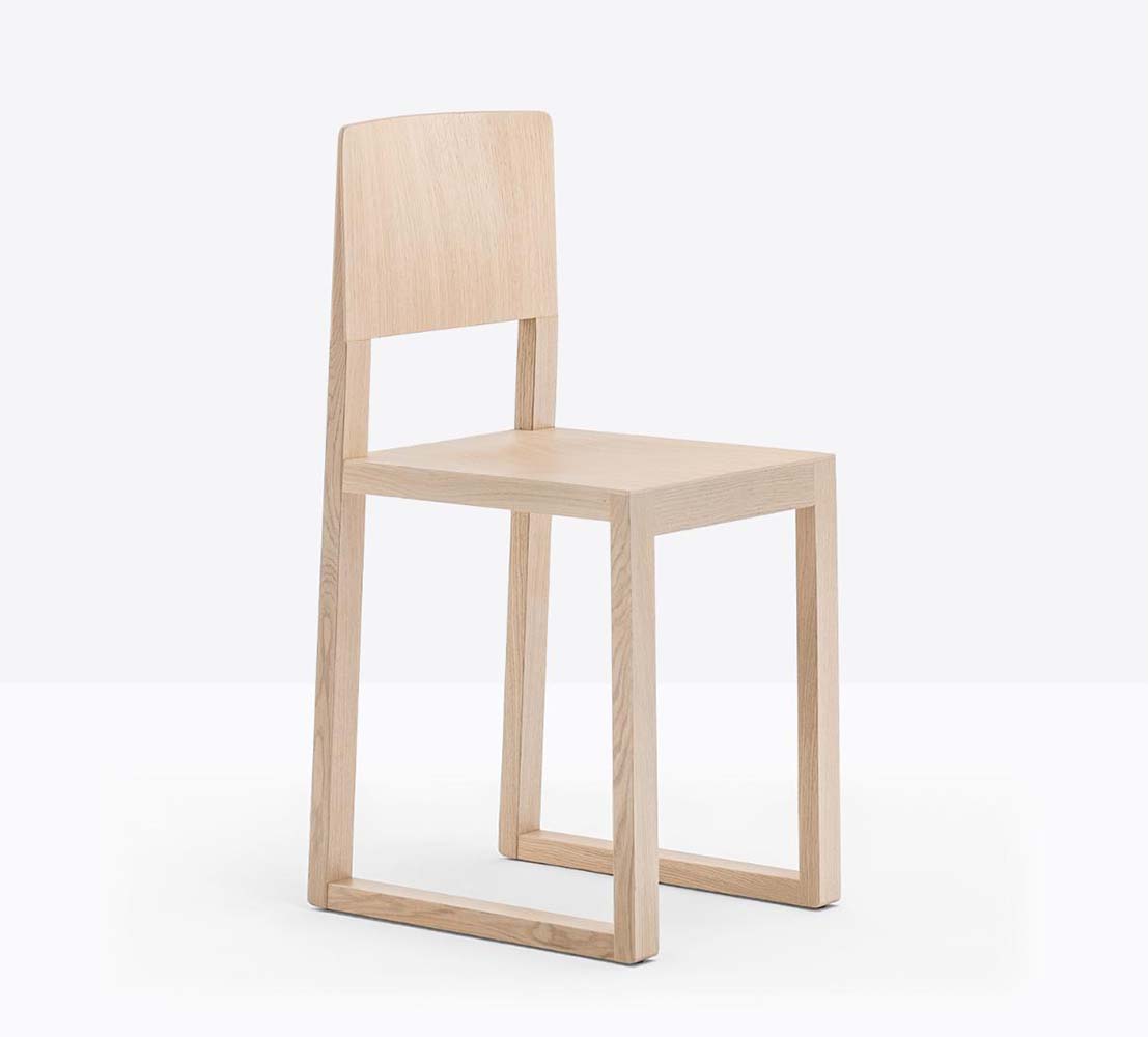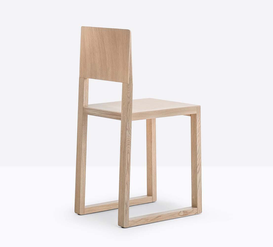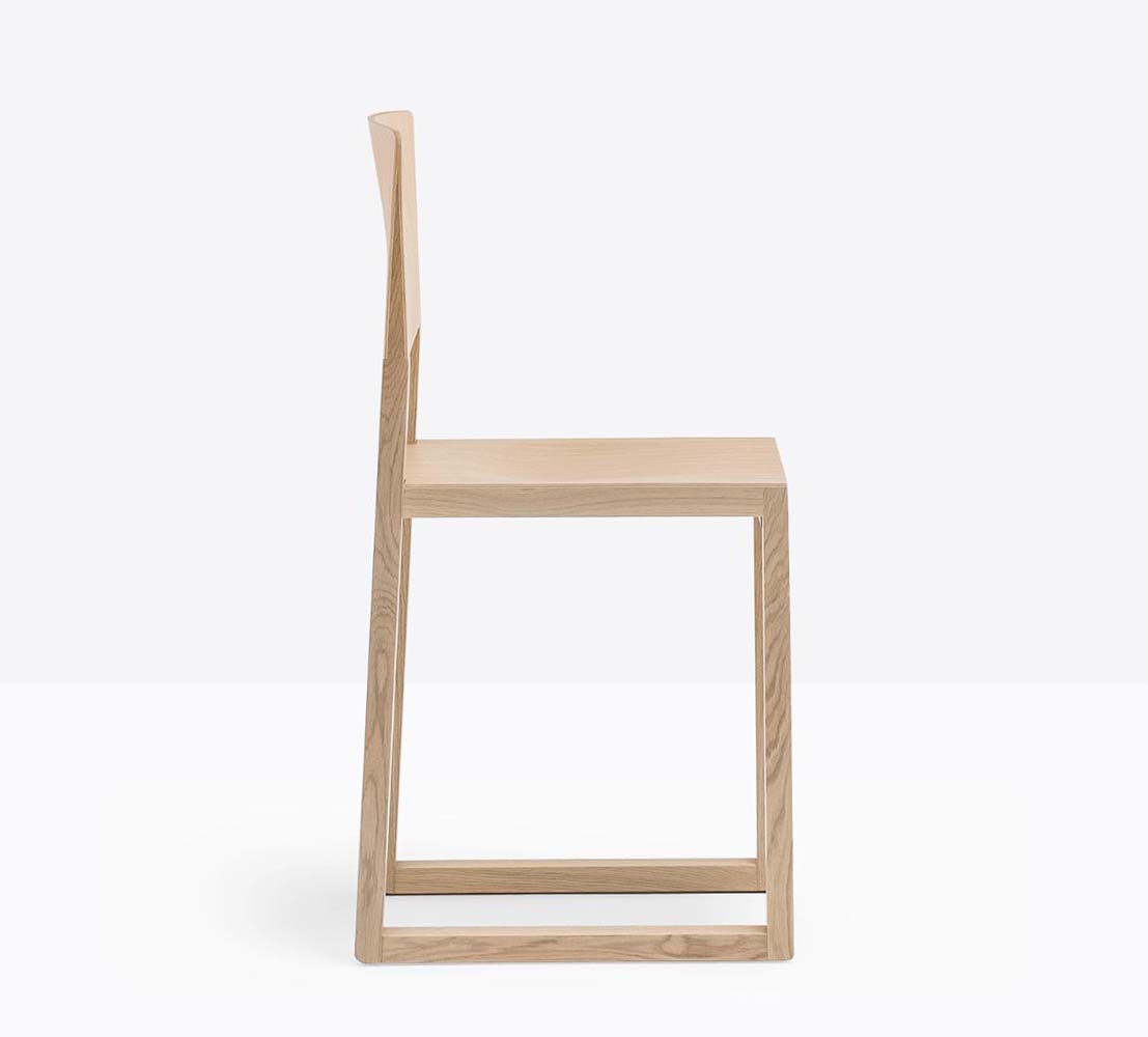 Chaise sans bras à base traîneau. Assise et dossier en bois, structure en chêne.