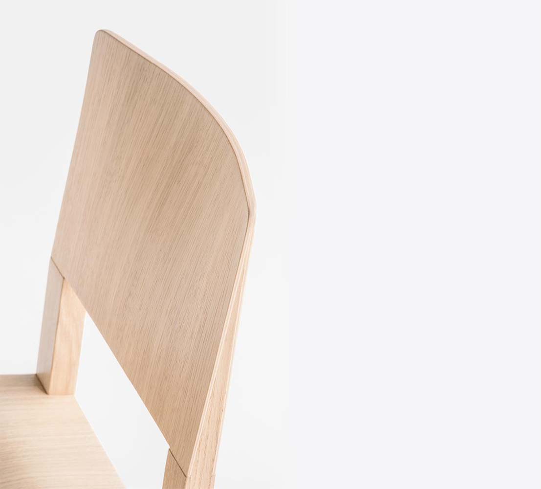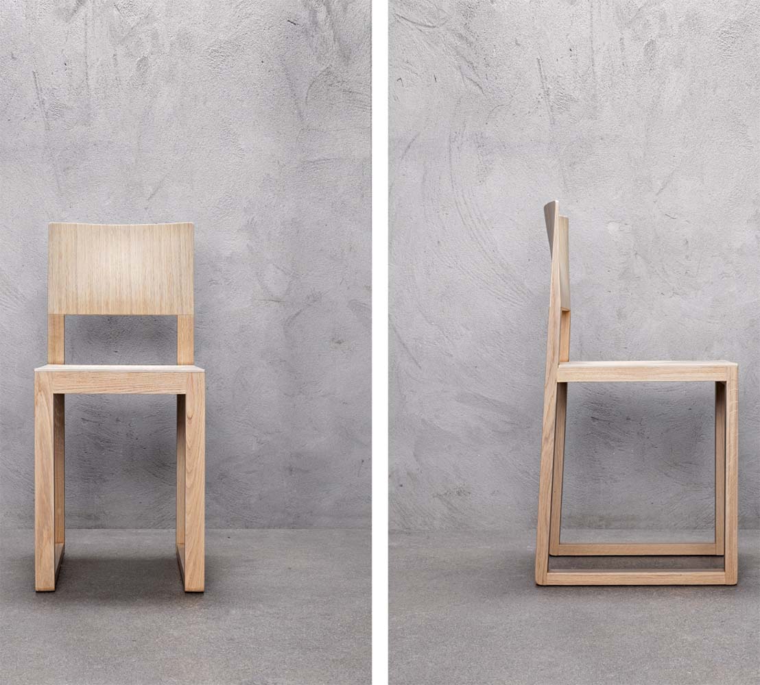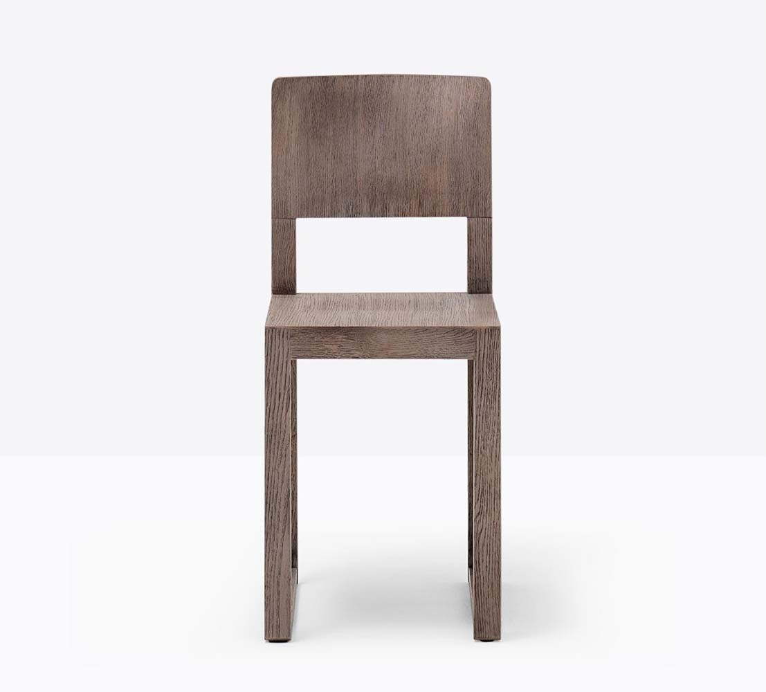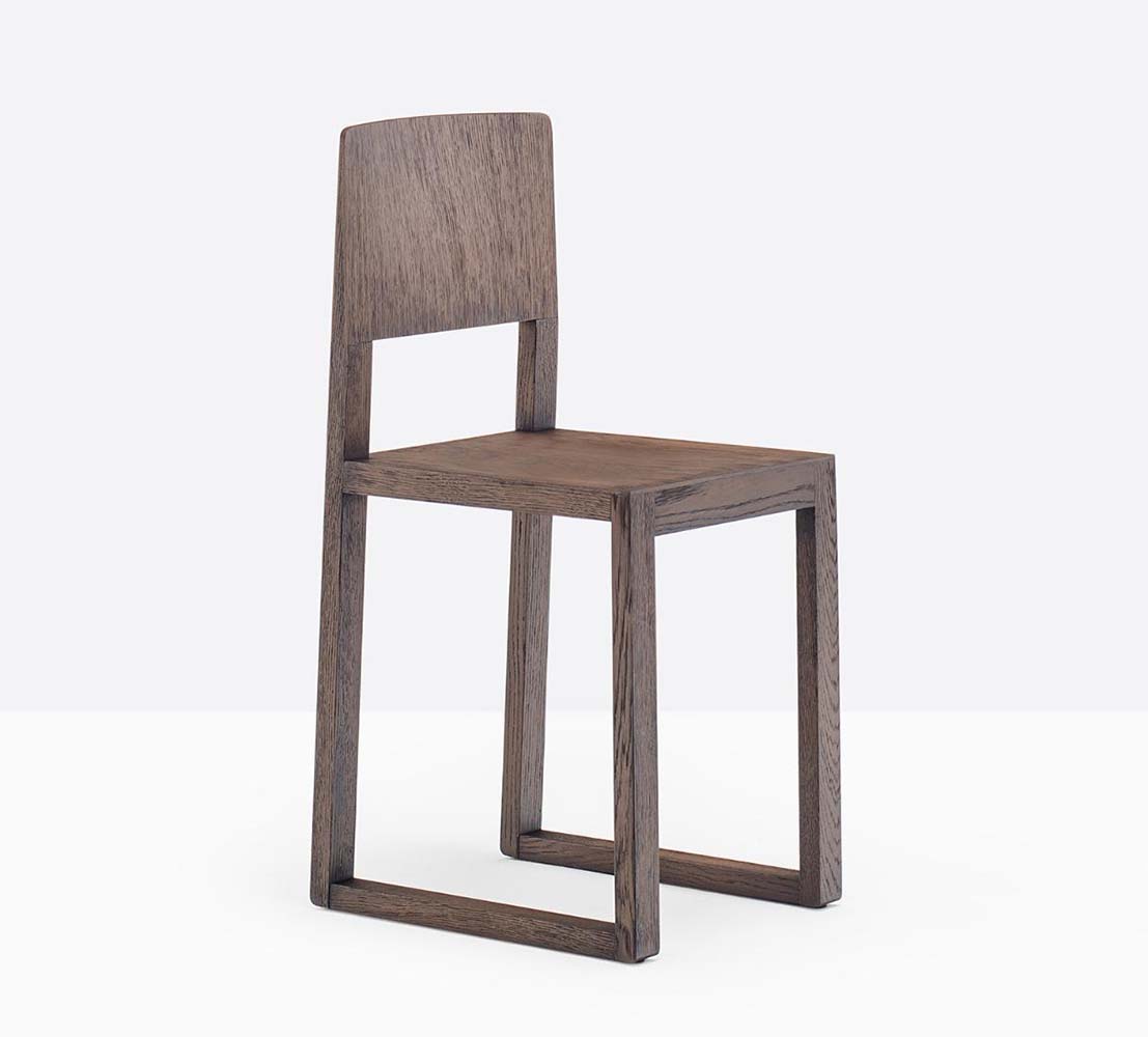 Chaise sans bras à base traîneau. Assise et dossier en bois, structure en chêne.