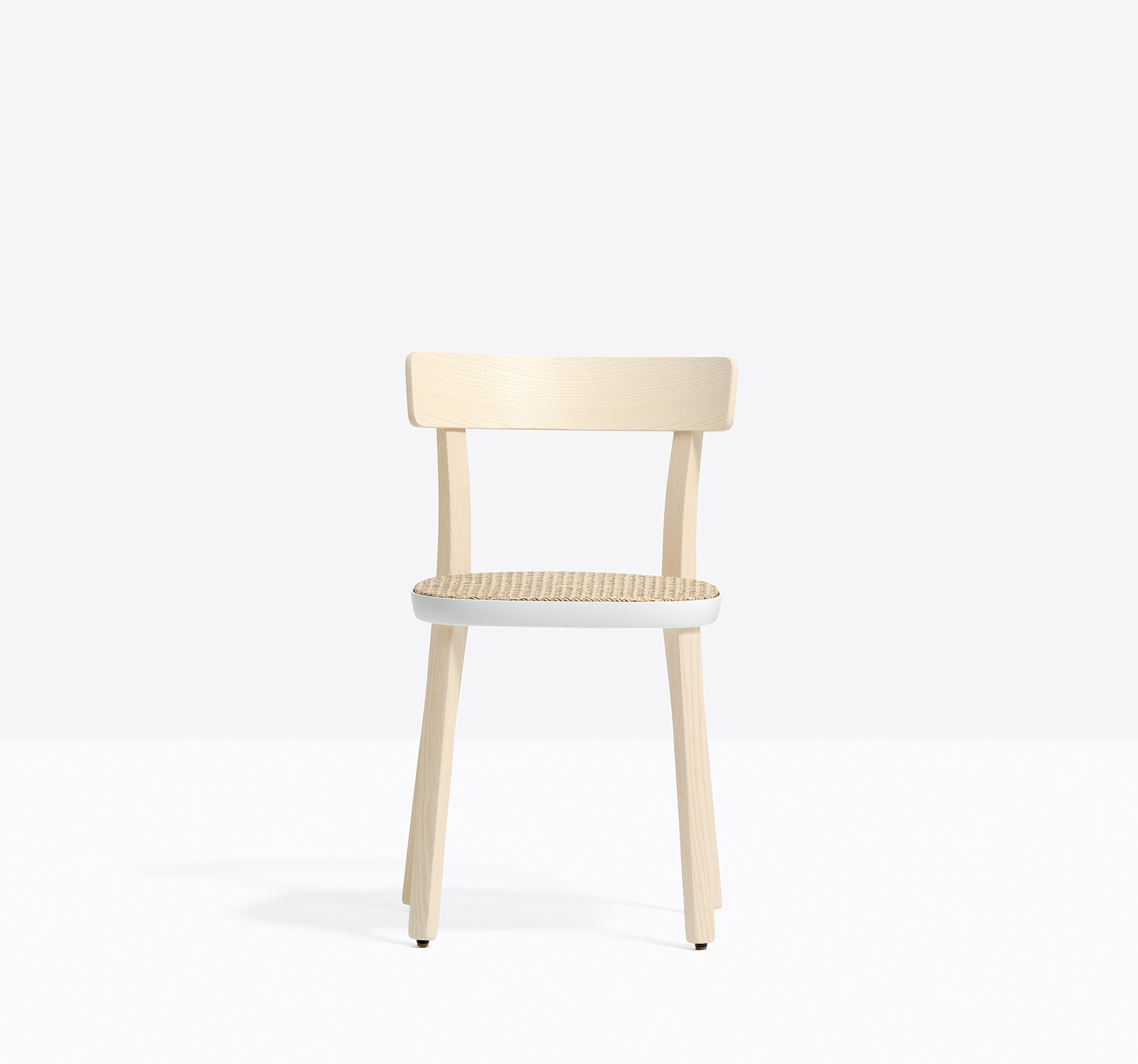Chaise sans bras, structure en frêne. Anneau en aluminium poli ou peint. Assise en paille de Vienne, renforcé avec fils de nylon. Dossier en contreplaqué courbé.