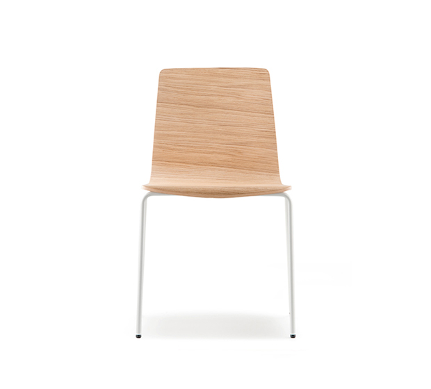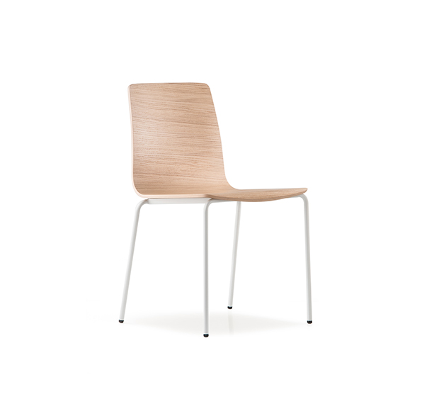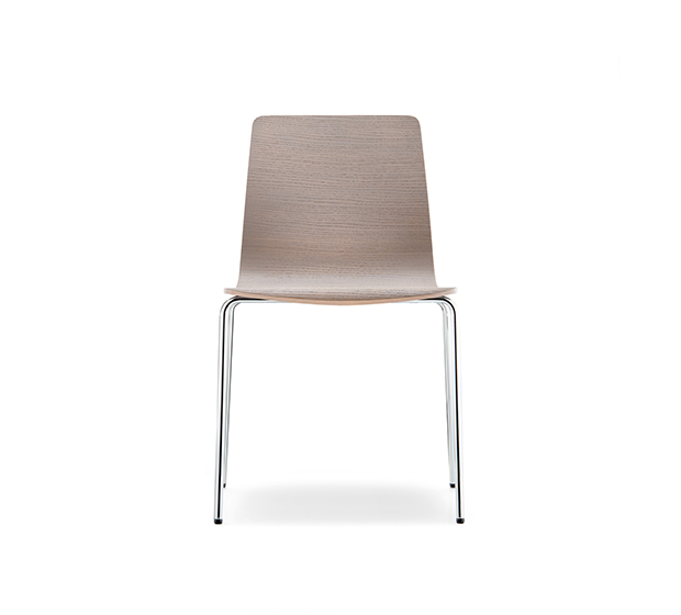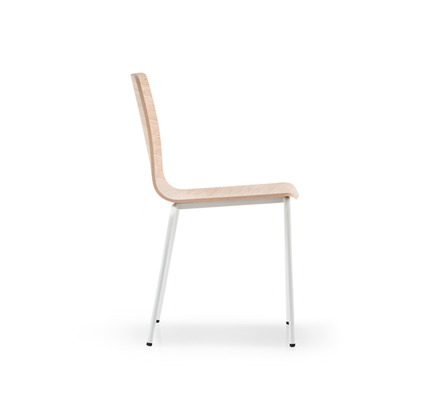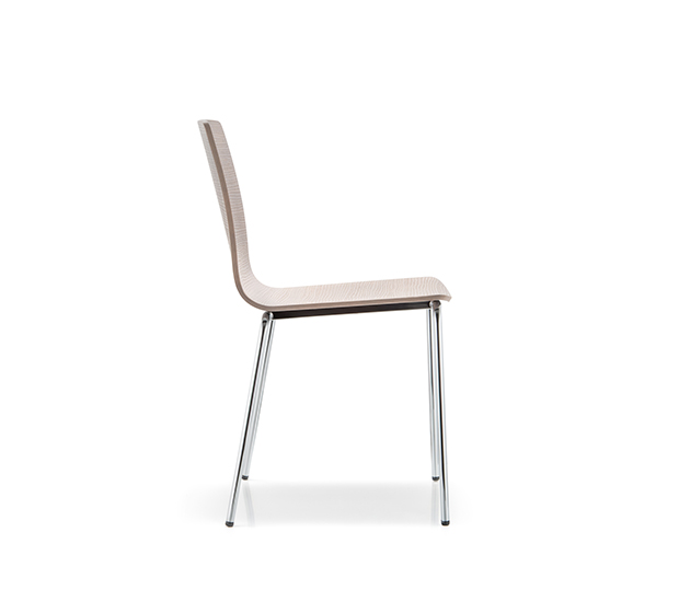 Chaise sans bras. Assise et dossier en bois, structure tubulaire ronde en acier chromé ou peint.