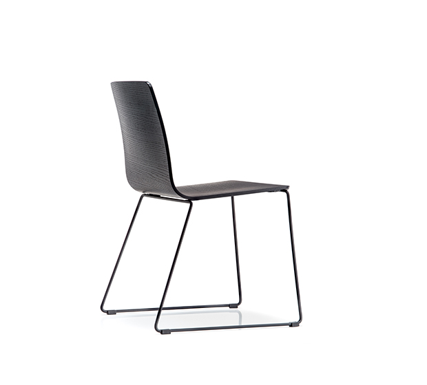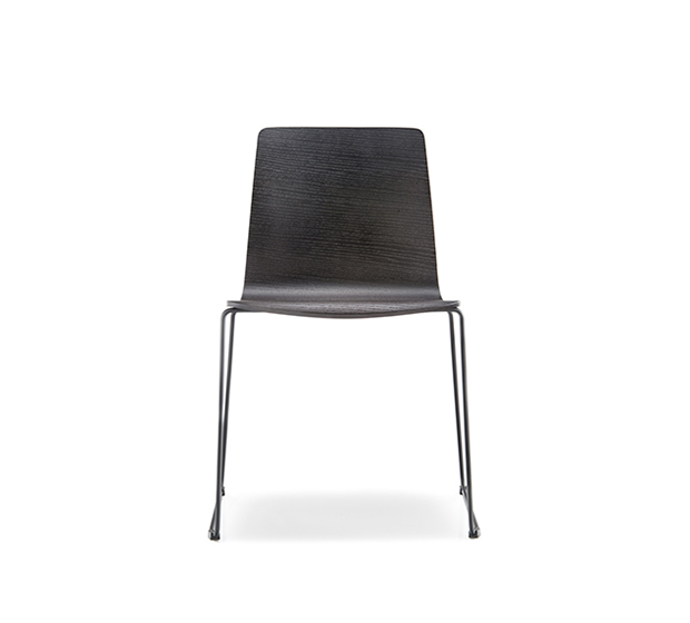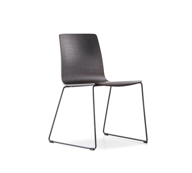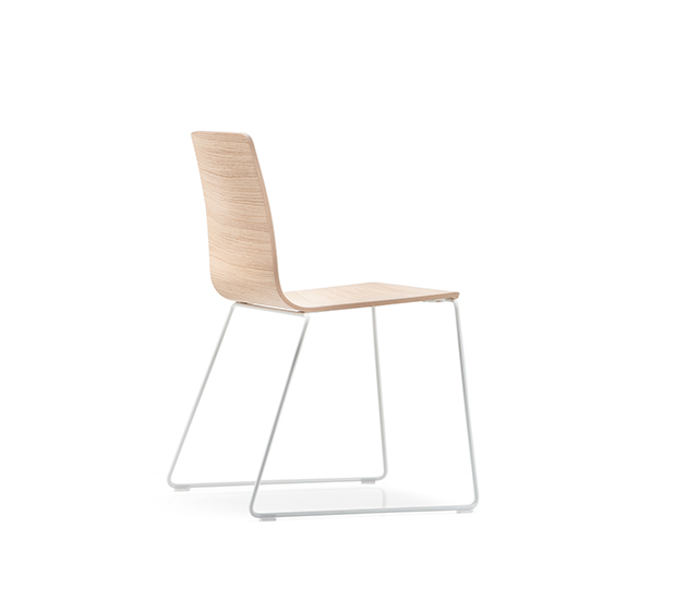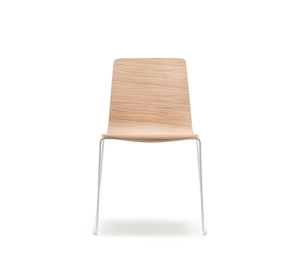 Chaise sans bras à base traineau. Assise et dossier en bois, structure tubulaire ronde en acier chromé ou peint.