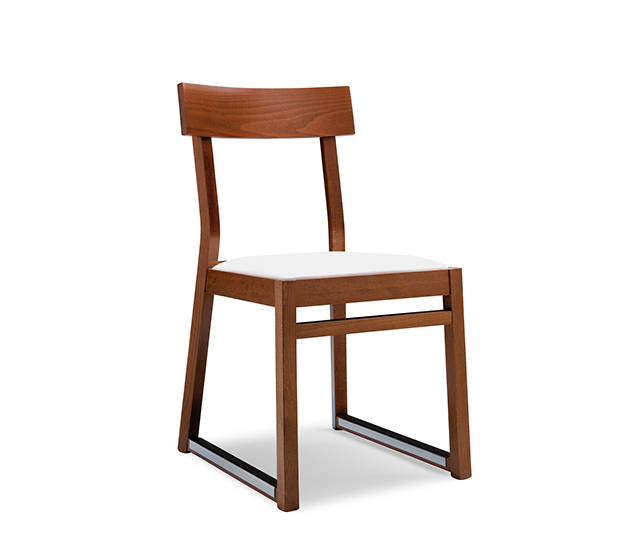 Chaise sans bras à base traineau. Assise en bois ou rembourrée et dossier en bois, structure en hêtre fini aniline, laqué ou antique.