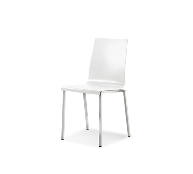 Chaise sans bras, empilable. Assise et dossier en technopolymère, structure tubulaire carrée en acier chromé, satiné ou peint.