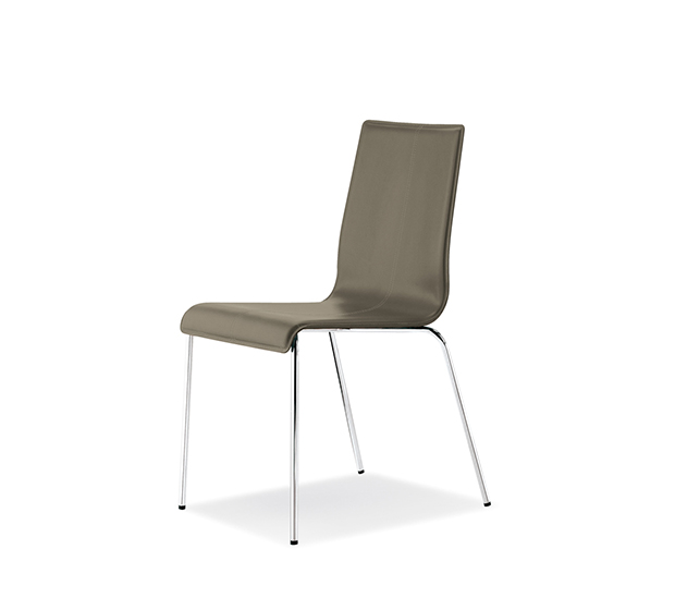 Chaise sans bras, empilable*. Assise et dossier rembourrés en cuir ou en cuir régénéré avec coutures visibles, structure tubulaire ronde en acier chromé, mat ou peint.