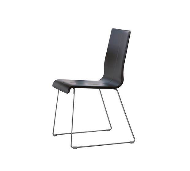 Chaise sans bras à base traîneau, empilable*. Assise et dossier rembourrés en cuir ou en cuir régénéré avec coutures visibles, structure tubulaire ronde en acier chromé ou peint.