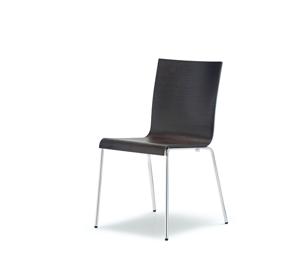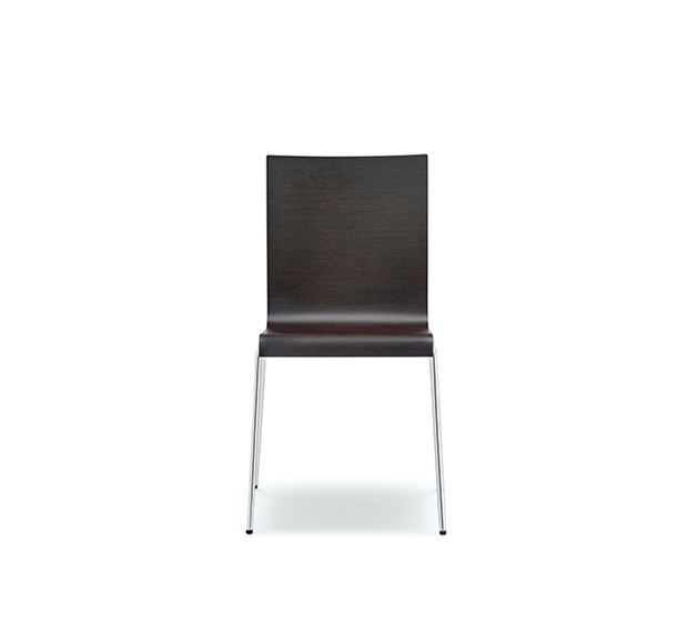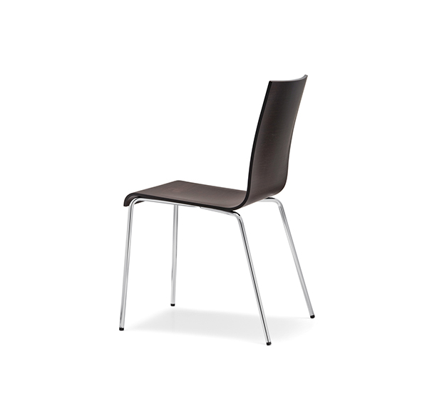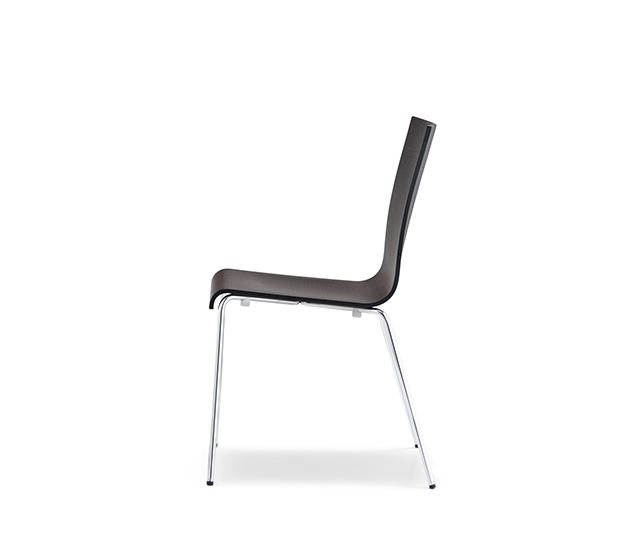 Chaise sans bras, empilable. Assise et dossier en bois, structure tubulaire ronde en acier chromé, mat ou peint argent.