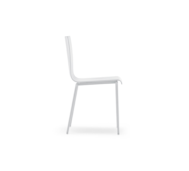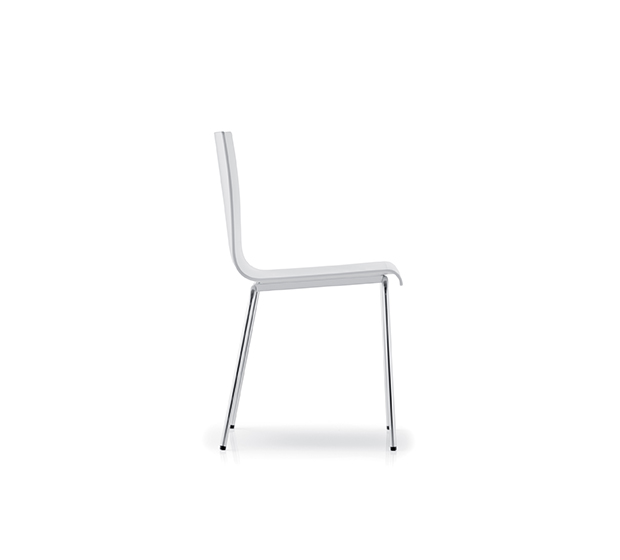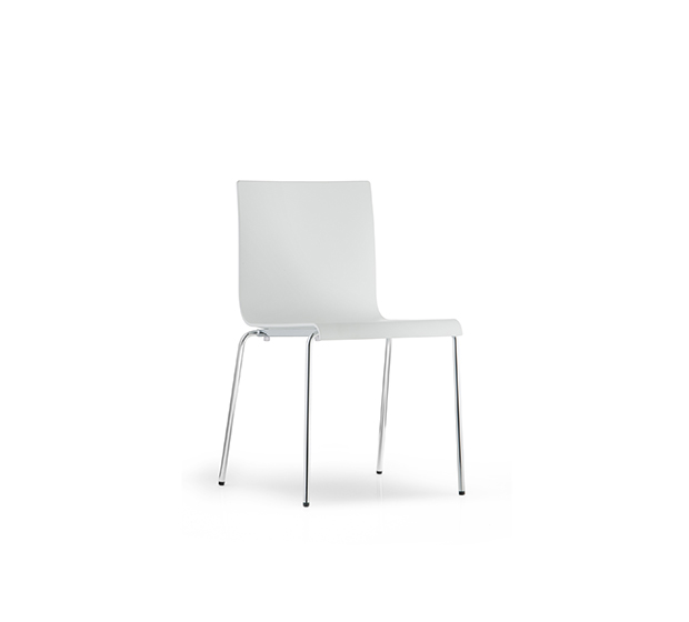 Chaise sans bras, empilable. Assise et dossier en technopolymère, structure tubulaire ronde en acier chromé, satiné ou peint.