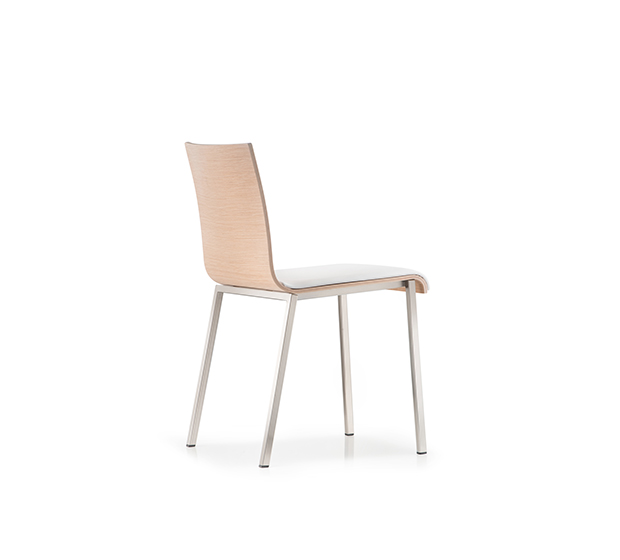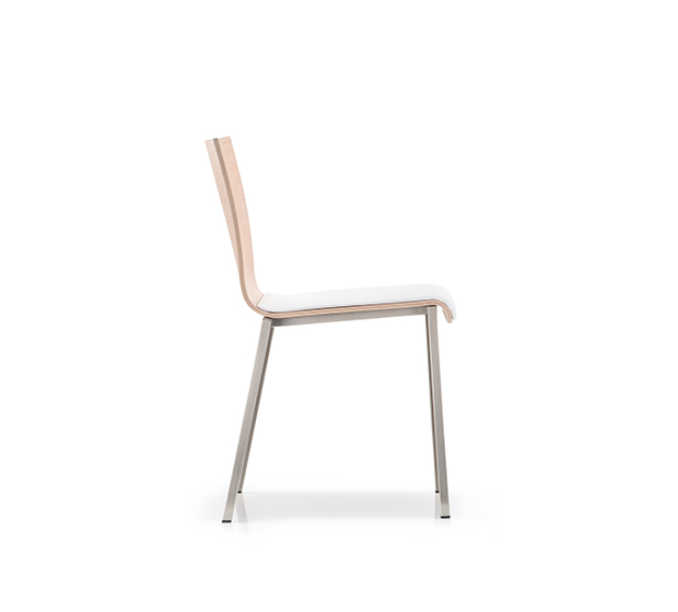 Chaise sans bras, empilable*. Assise et dossier en bois avec coussin rembourré sur l’assise, structure tubulaire carrée en acier chromé, satiné ou peint.