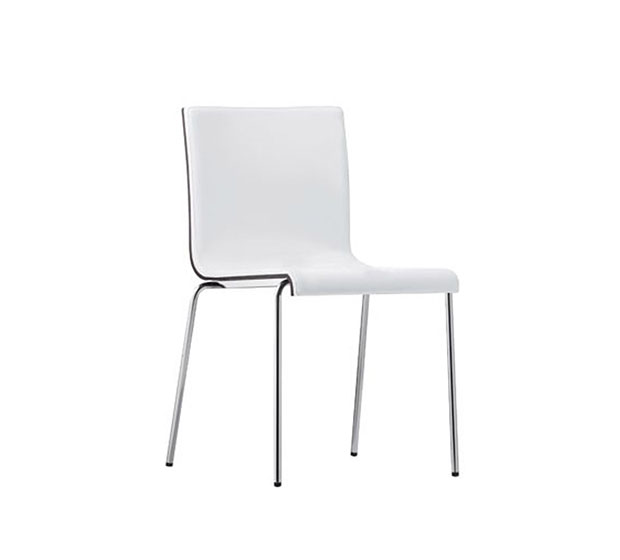 Chaise sans bras, empilable*. Assise et dossier en bois avec l’intérieur de l’assise et du dossier rembourrés, structure tubulaire ronde en acier chromé ou peint.