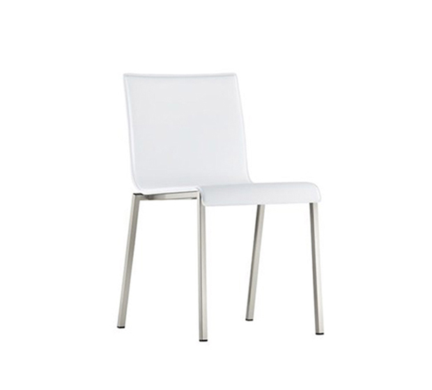 Chaise sans bras, empilable*. Assise et dossier rembourrés en cuir véritable ou régénéré avec coutures visibles, structure tubulaire carrée en acier chromé, satiné ou peint.