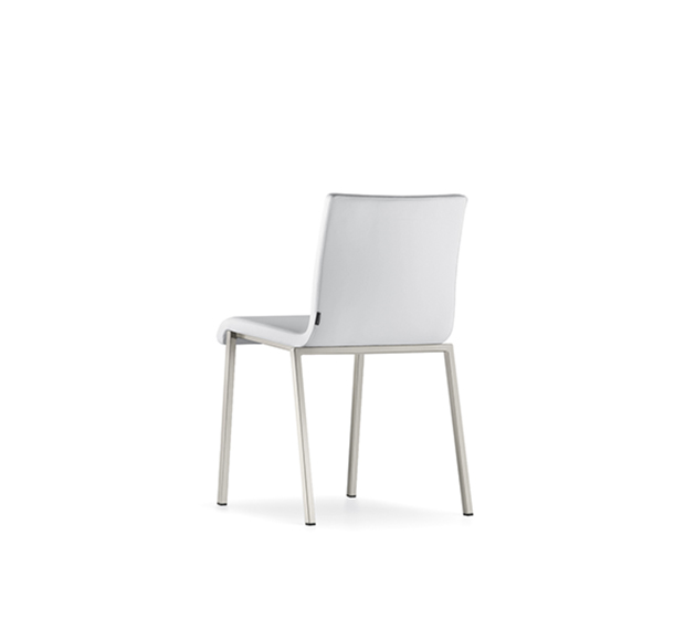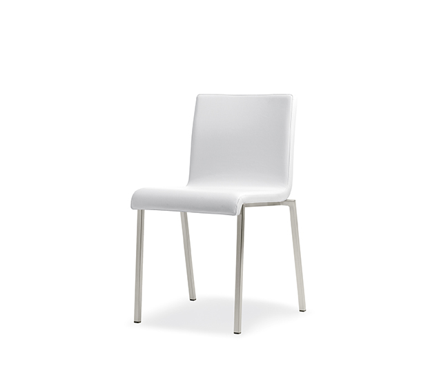 Chaise sans bras, empilable*. Assise et dossier rembourrés, structure tubulaire carrée en acier chromé, satiné ou peint.