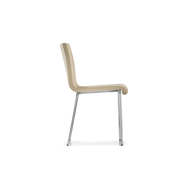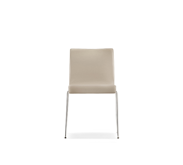 Chaise sans bras, empilable*. Assise et dossier rembourrés, structure tubulaire ronde en acier chromé ou peint.