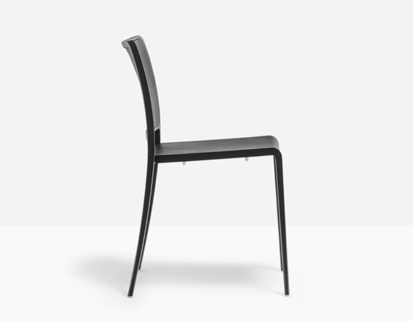 Chaise sans bras, empilable. Assise en polypropylène, dossier en maille, structure en aluminium. Adaptée à l’usage extérieur.