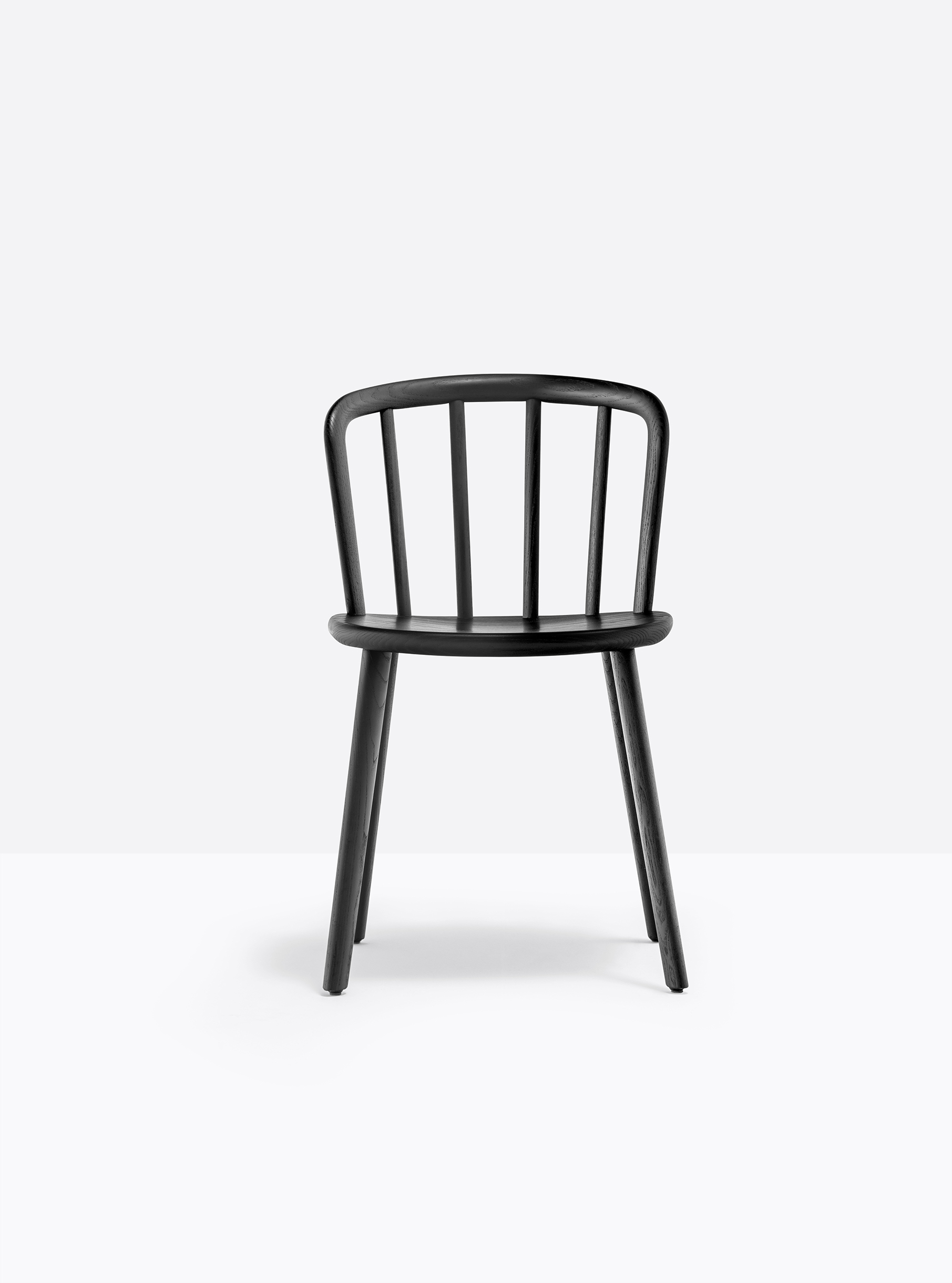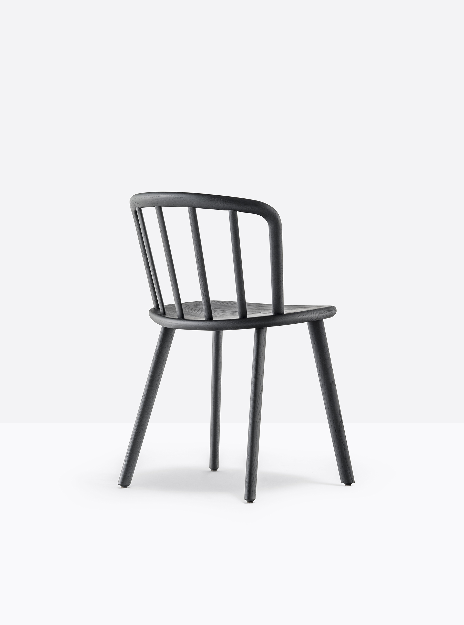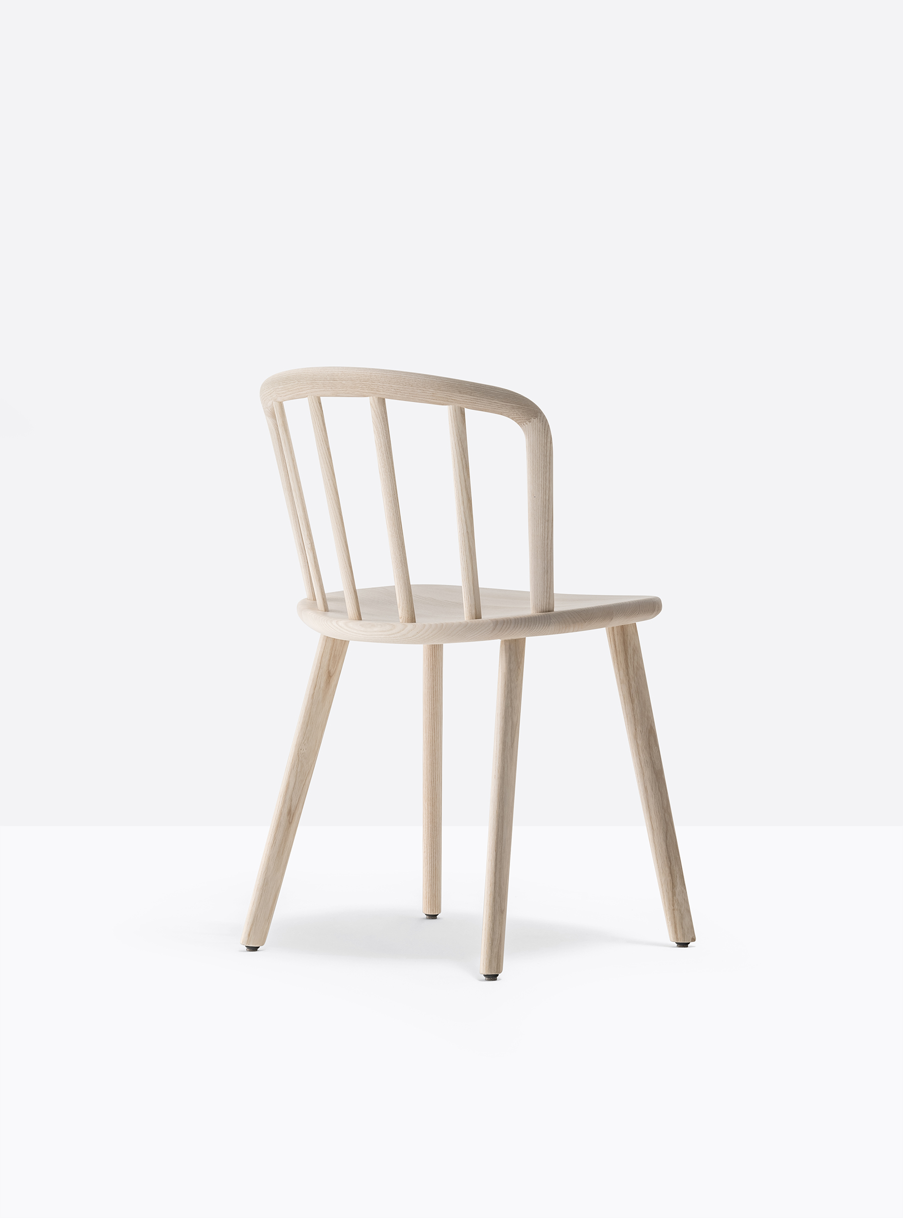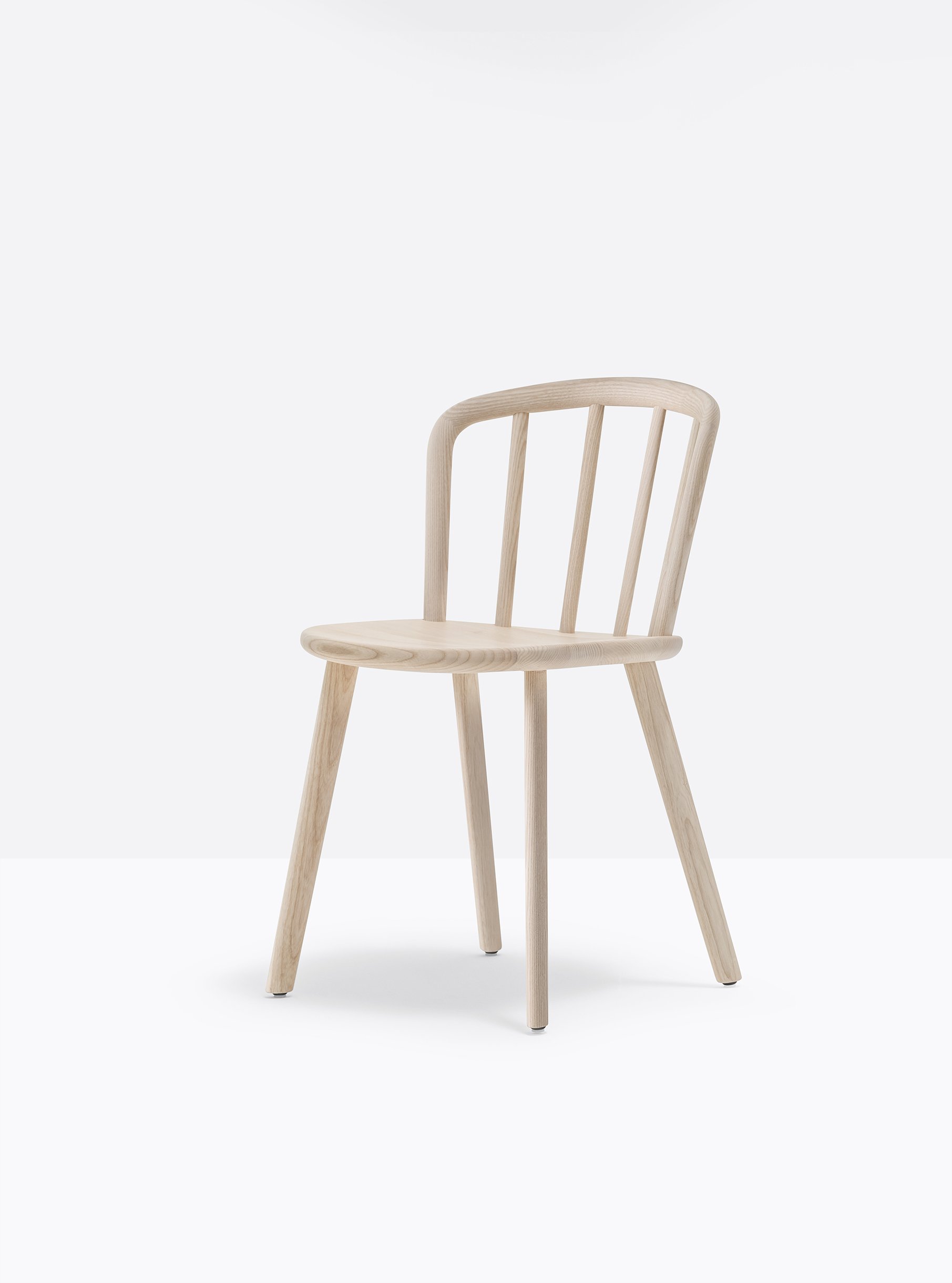 Chaise sans bras. Assise, dossier et pattes en bois de frêne. Dossier vouté en bois courbé.