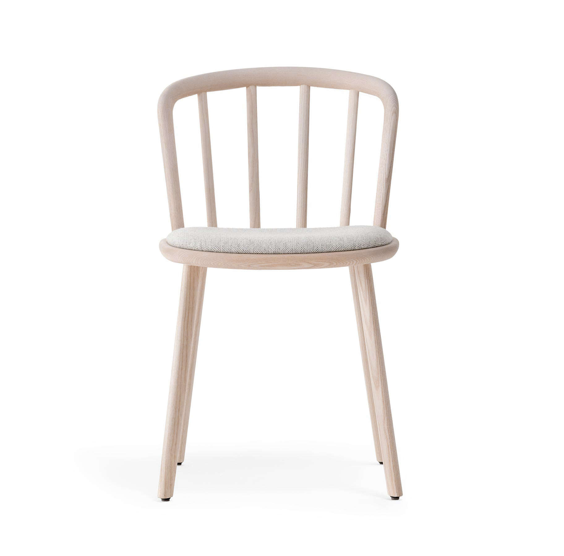 Chaise sans bras. Structure, dossier et pattes en bois de frêne. Assise coussinée. Dossier vouté en bois courbé.