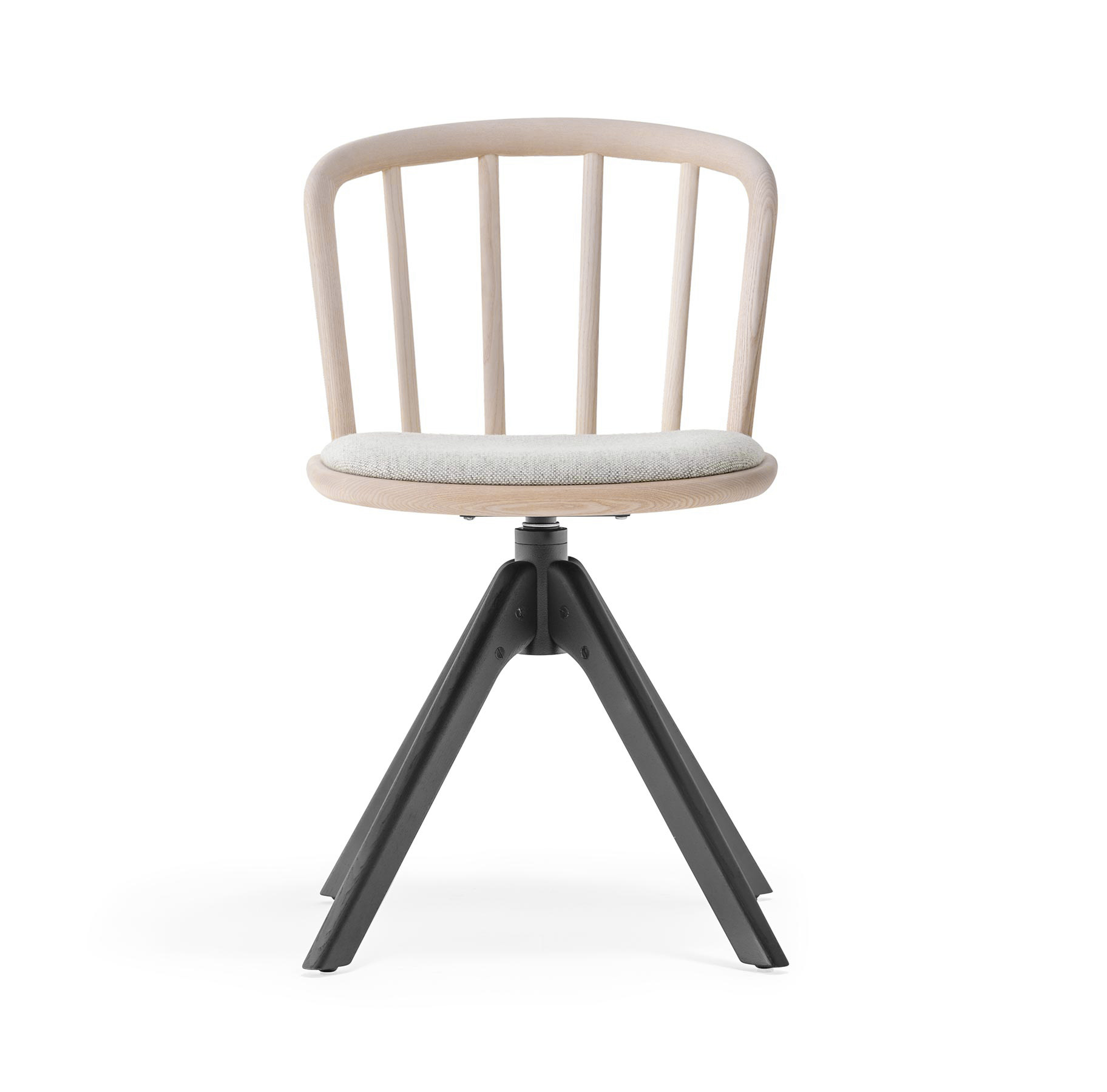 Chaise sans bras. Structure, dossier et pattes en bois de frêne. Assise coussinée. Dossier vouté en bois courbé. Base centrale pivotante avec mécanisme de retour.