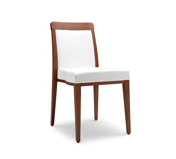Chaise sans bras, empilable. Assise et dossier rembourrés, structure en hêtre fini aniline, laqué ou antique.