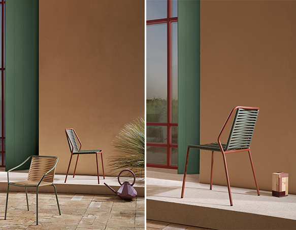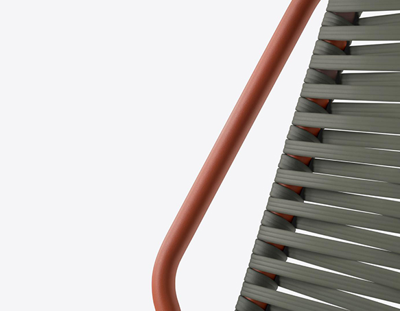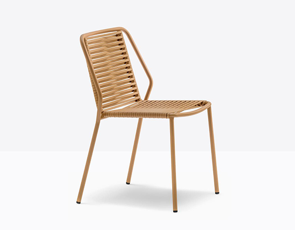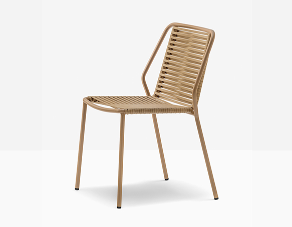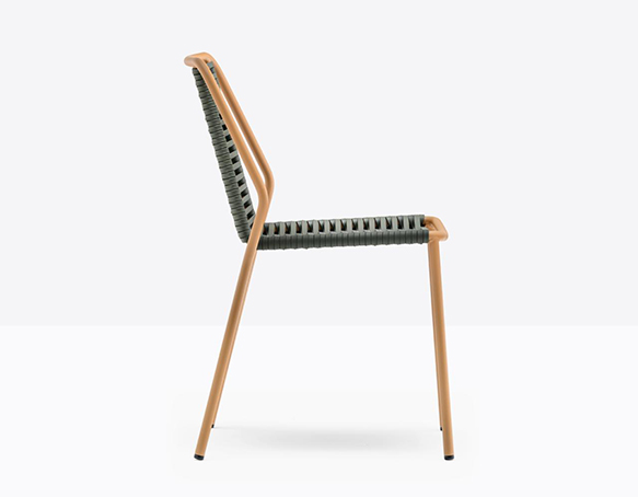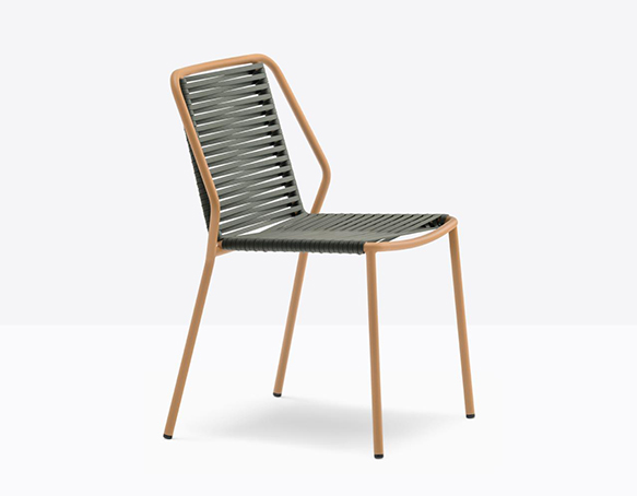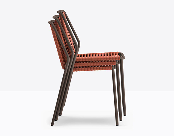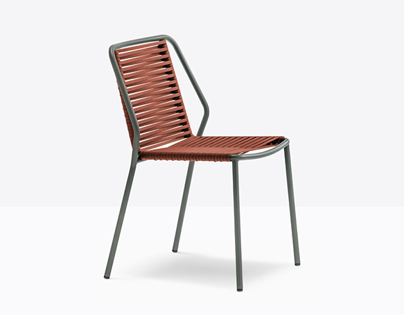 Chaise sans bras pour l’extérieur. Structure en acier peint pour l’extérieur. Assise et dossier en PVC renforcé de nylon. Chaise empilable.