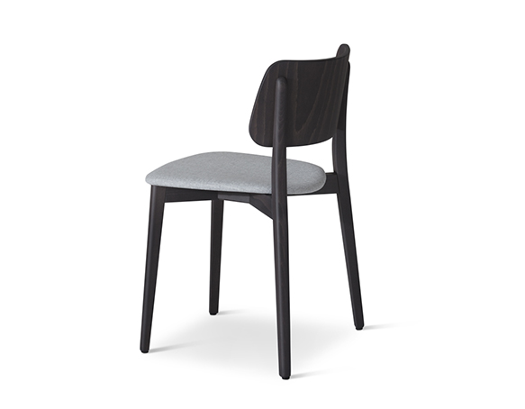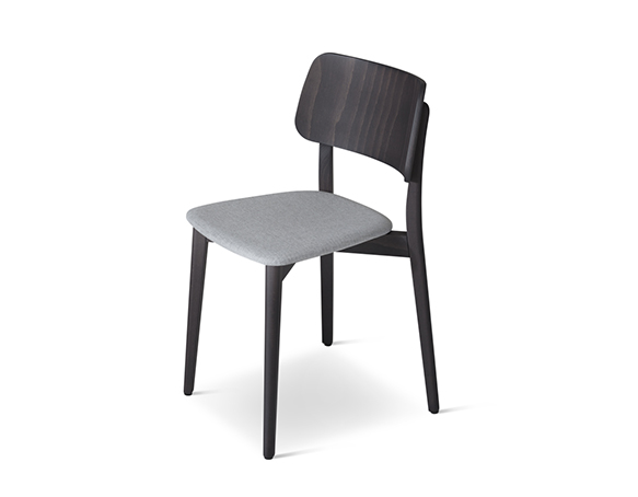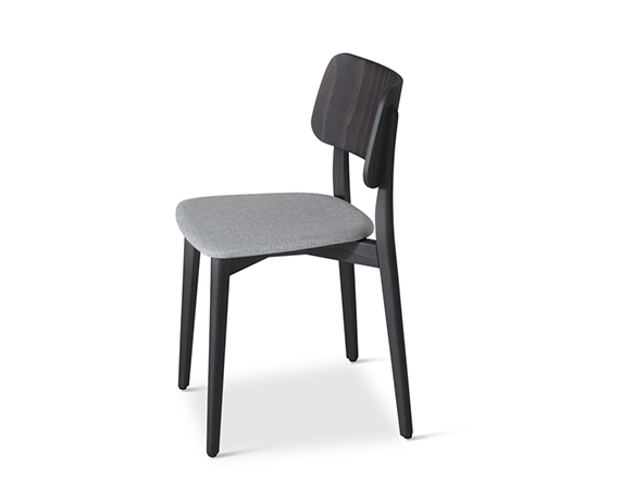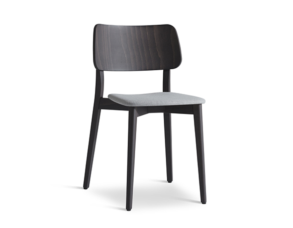 Chaise sans bras. Structure en bois, assise rembourrée. Disponible en bois teint ou laqué.