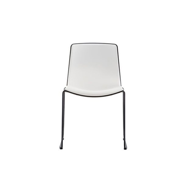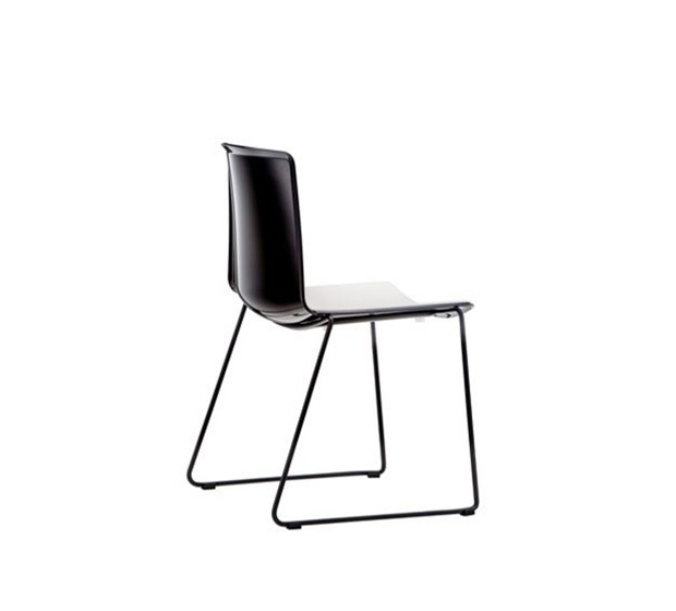 Chaise sans bras à base traîneau, empilable. Assise et dossier en polypropylène, fini brillant à l’extérieur et fini anti-rayure mat à l’intérieur, structure tubulaire ronde en acier chromé, chromé noir ou peint. Structure peinte non disponible dans les finis AR et GI.